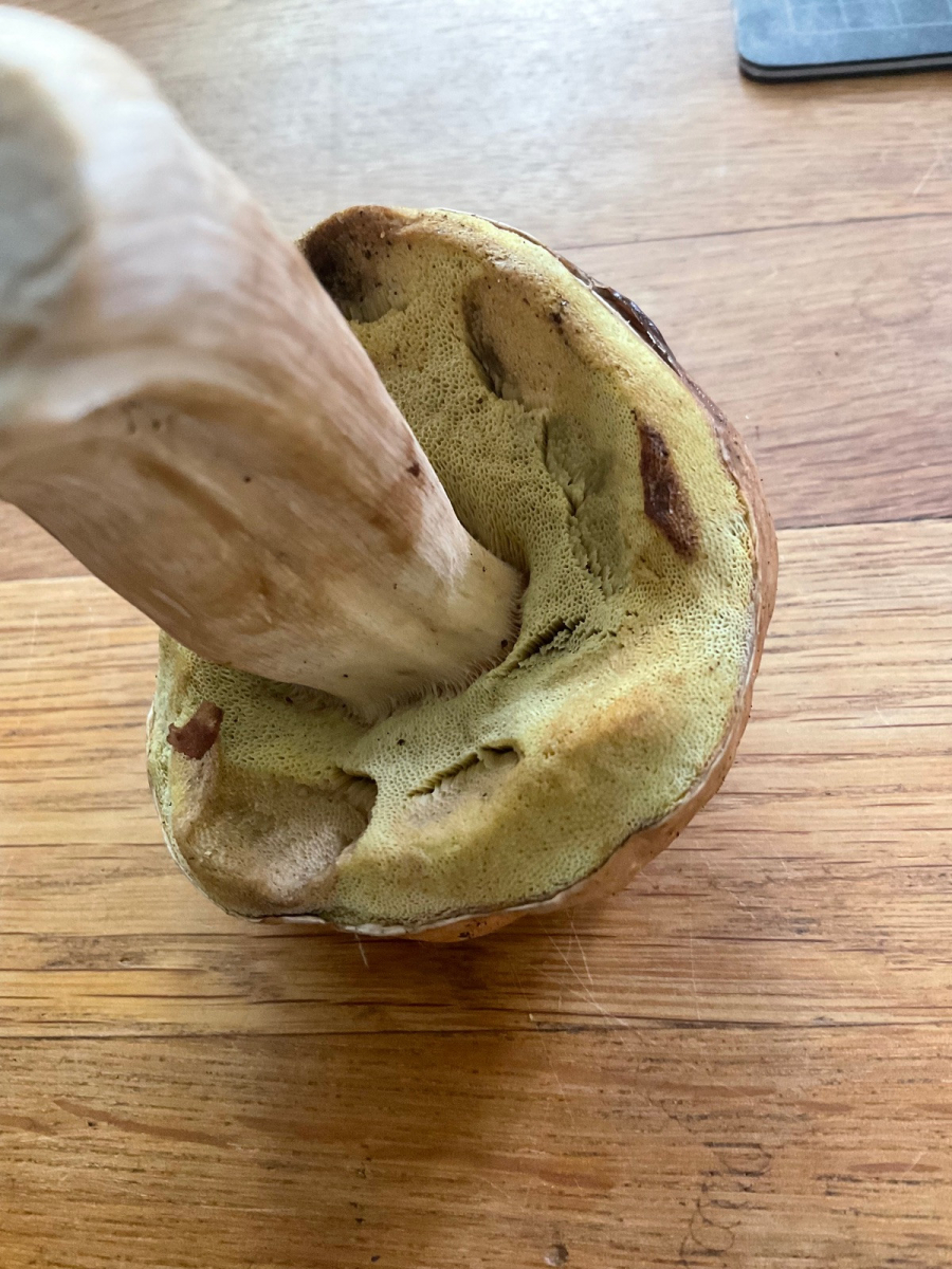 Der schwamm verfärbt sich nicht beim eindrücken, gestern war der Schwamm noch weiß und über Nacht Gelb verfärbt. Riecht frisch, in Richtung Champignon.