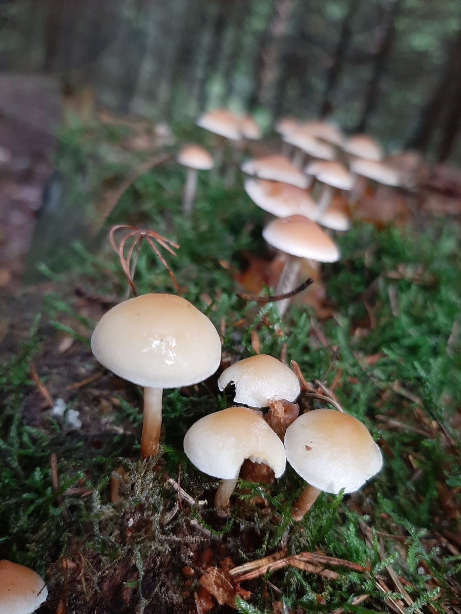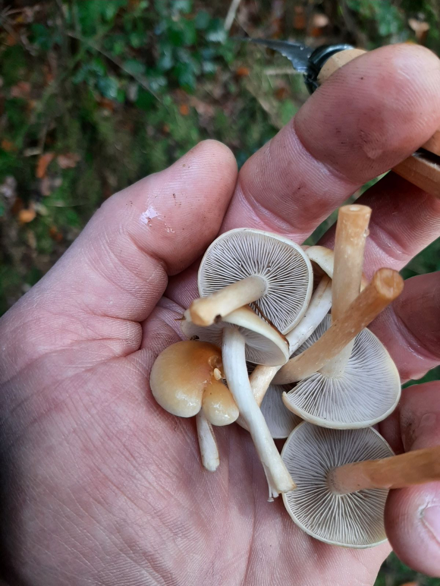 ...Nach Entnahme der Pilze fühlte ich mich in meiner Vermutung bestätigt, dass es sich definitiv nicht um die gleiche Art handelt. Könnte es sich hierbei tatsächlich um Gifthäublinge handeln, die sich extrem gut getarnt unter die Rauchis gemogelt haben? So oder so, definitiv ein gewaltiger Tritt in den "Achtsamkeitshintern".