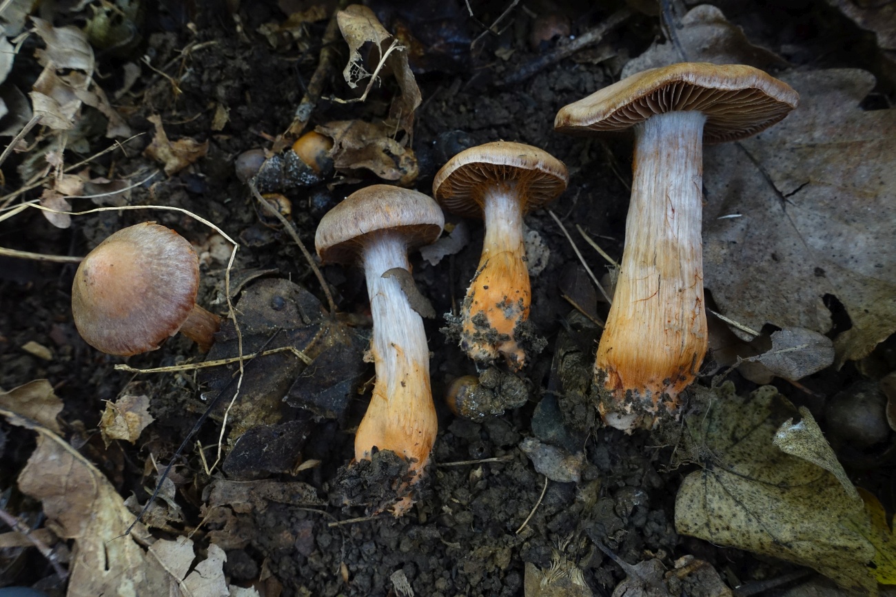 Zunächst eine Telamonie, die man tatsächlich direkt im Feld sofort ansprechen kann - wenn man ihr denn unters Röckchen schaut, statt achtlos daran vorbei zu laufen. Der Feuerfüßige Gürtelfuß (Cortinarius bulliardii) hat ein zinnoberrotes Velum im unteren Stielbereich, dass wirklich spektakulär leuchtet. Ich finde die Art jedes Jahr stets an der gleichen Stelle auf ziemlichen trockenem, lehmigem Boden unter Eichen.