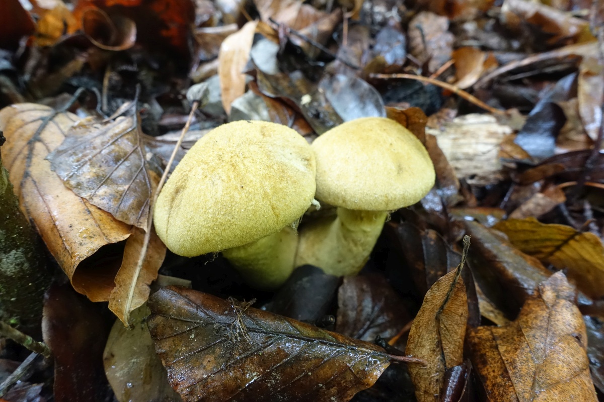 Zum Schluss noch ein kleines zierliches Pilzchen, welches gesellig unter (Hain)Buchen wächst. Der filigrane Wuchs und der gebuckelte Hut lassen eher an eine Telamonie denken, aber die in jungem Zustand auffällig lebhaft gelbgrün gefärbten Lamellen weisen zu den Hautköpfen: Grünblättriger Hainbuchen-Hautkopf (Cortinarius oliveaceofuscus).