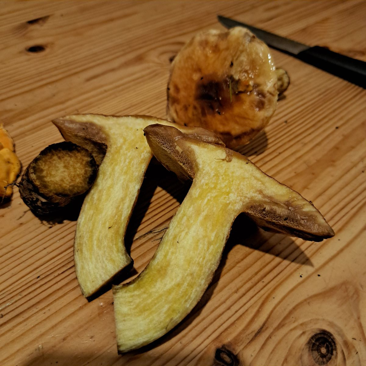 Hier sind noch ein paar flockenstielige Hexenröhrlinge. Habe sie leider schon geputzt daher sind sie so verfärbt ![]()