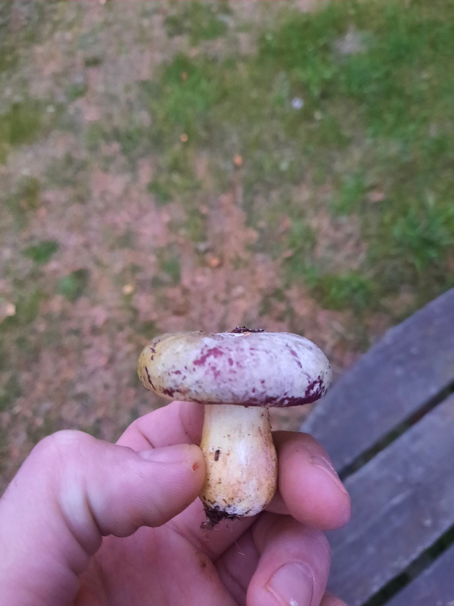 • Könnte eben ein mit irgendwas überhauchter Reizker oder Täubling sein. Wenn der weinrot milcht, ist es kein Täubling, dann ein Reizker, was da im Endeffekt an Überzug drauf ist, das ist nicht mehr klar zu ergründen. Kannst ja beim nächsten Mal genauere Bilder machen, wenn du wieder Fragen hast zu einer gefundenen Art.
