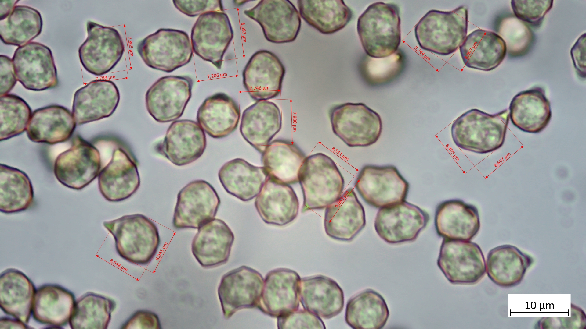 Sporen nahezu isodiametrisch: 7,9-9,1 µm (av. 8,4 µm, SD 0,4 µm) x 7,2-8,5 µm (av. 7,9 µm, SD 0,5 µm); Q = 1,0-1,2 (av. 1,1, SD 0,1)(n = 7)