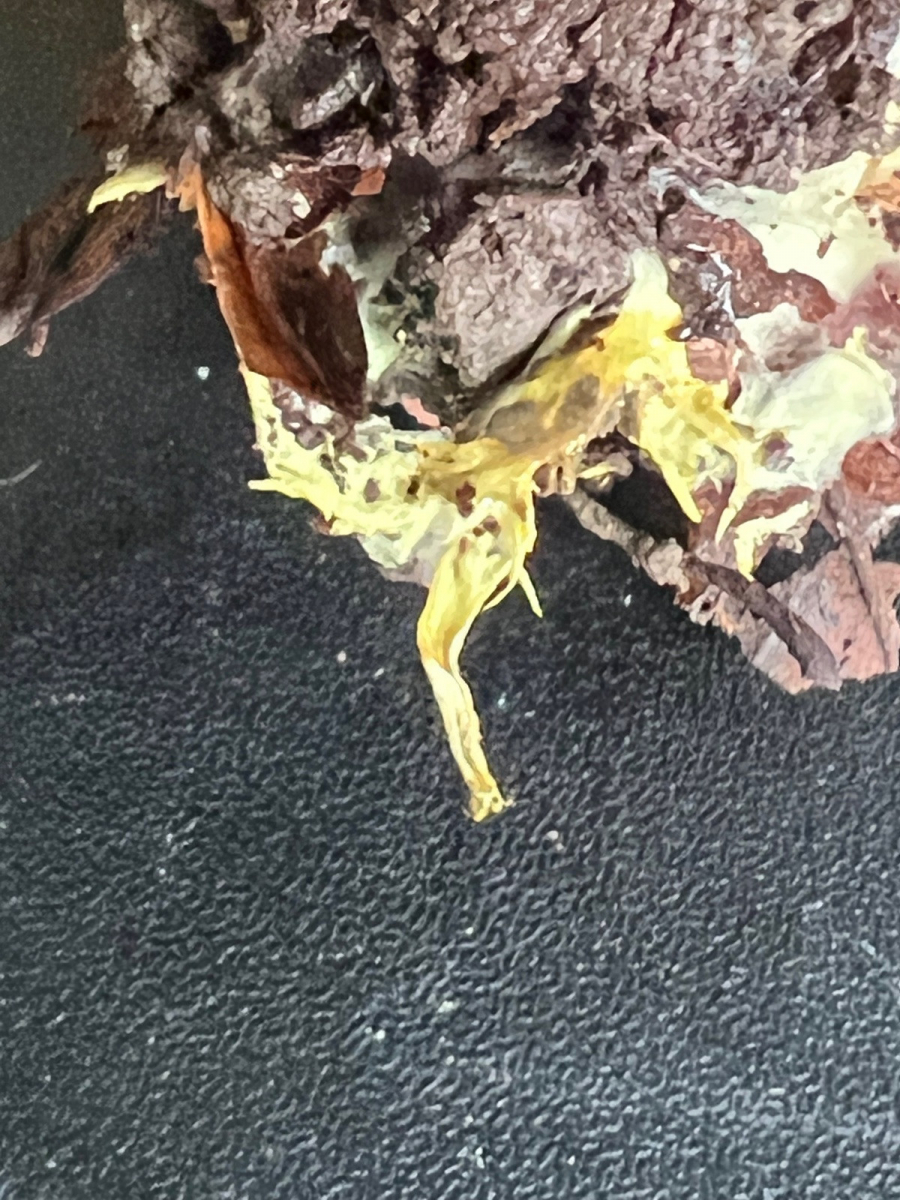 Der Pilz ist m Mg nach leuchtendgelb (die Farben kommen bei meiner Handyknipserei bicht gut raus) - keine Reaktion auf KOH. Basismyzeo gelb.