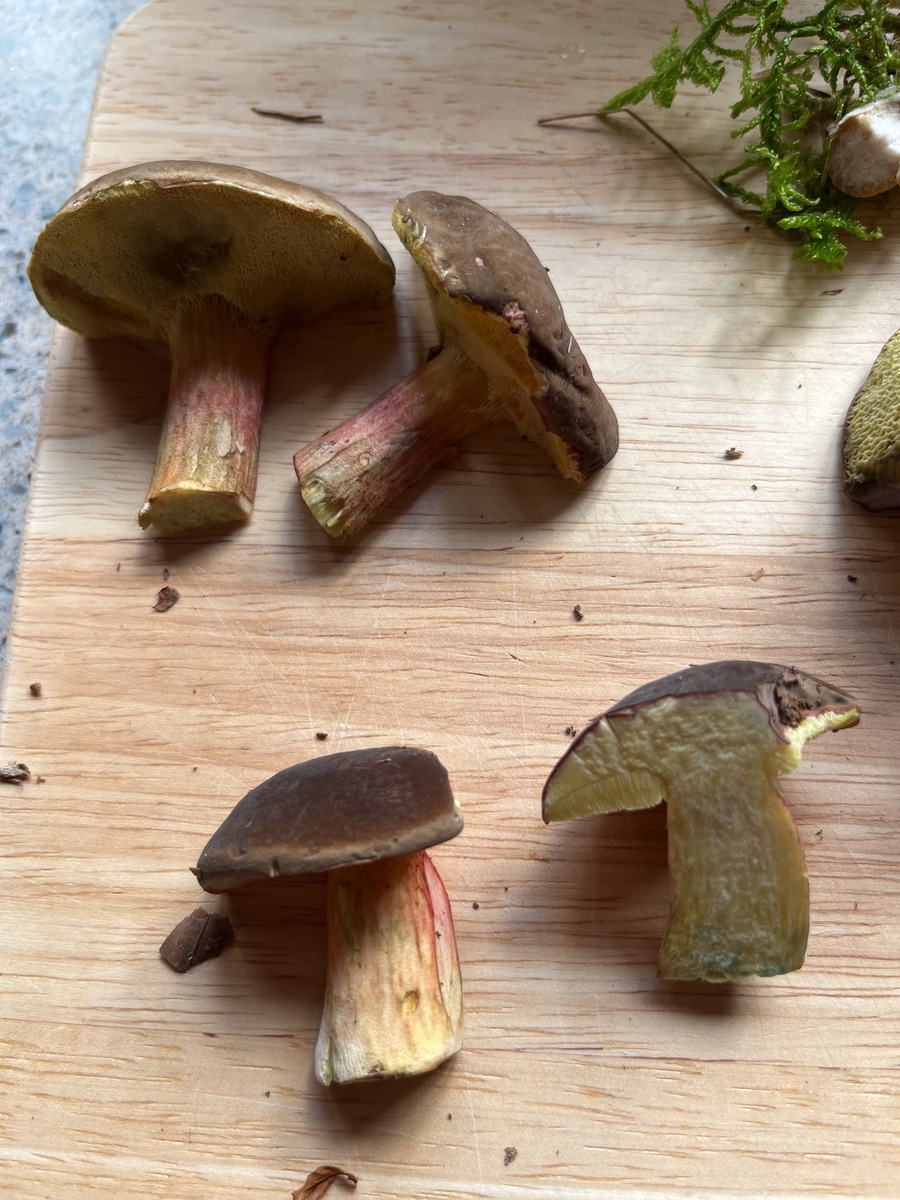 Handelt es sich eurer Meinung nach um einen Rotfussröhrling? Und bei dem kleinem Freund um einen Steinpilz oder um eine Marone?