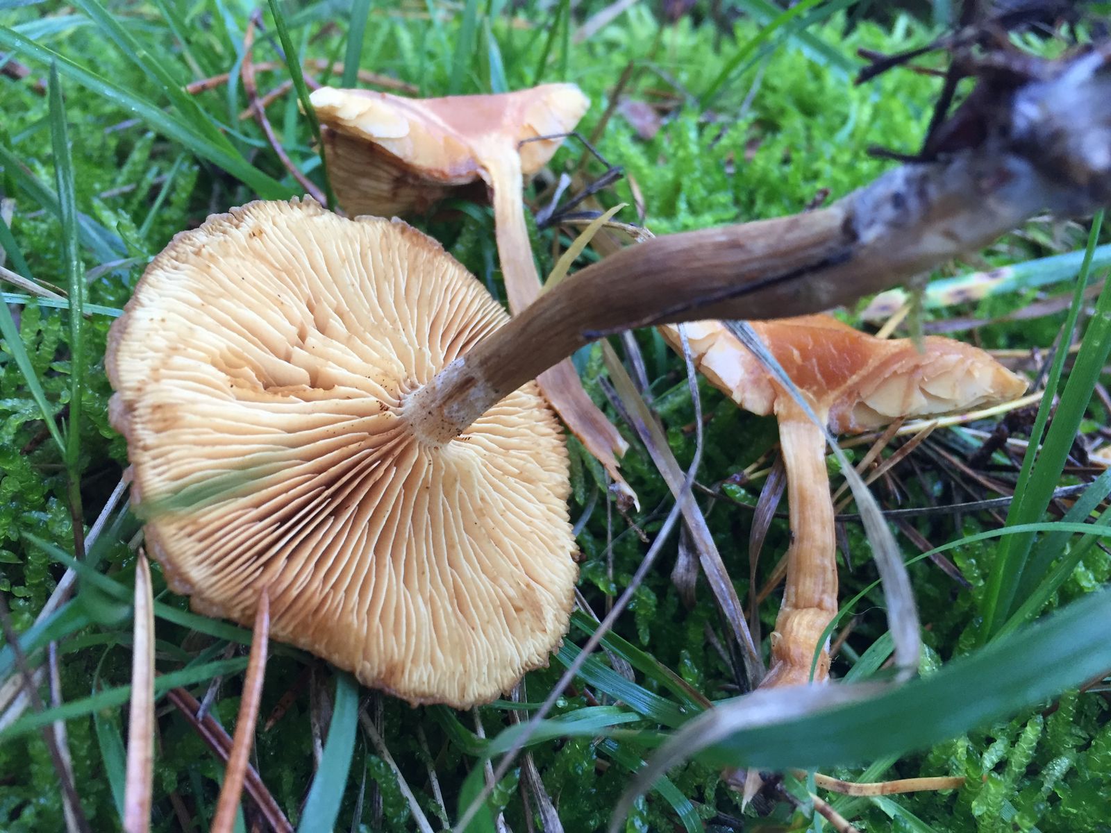 Wobei das Holz auch irgendwo im Boden, unterm Moos, eingebaut sein kann, als kleine, überwucherte Ästchen oder so. Dann findet man die Fruchtkörper auch scheinbar im Moos bzw. auf dem Boden wachsend. Ist aber immer Holz drunter. Dieses weißliche Velum am Stiel / Stielspitze kann Tricholoma fulvum nicht bilden. Bei dem umgedrehten Fruchtkörper auf dem ersten Bild rechts / mittig sieht es sogar so aus, als wäre diese Velumzone zudem noch bräunlich bepudert. Sollte das Sporenpulver sein, wäre jedwede Tricholoma hier ohnehin auszuschließen.