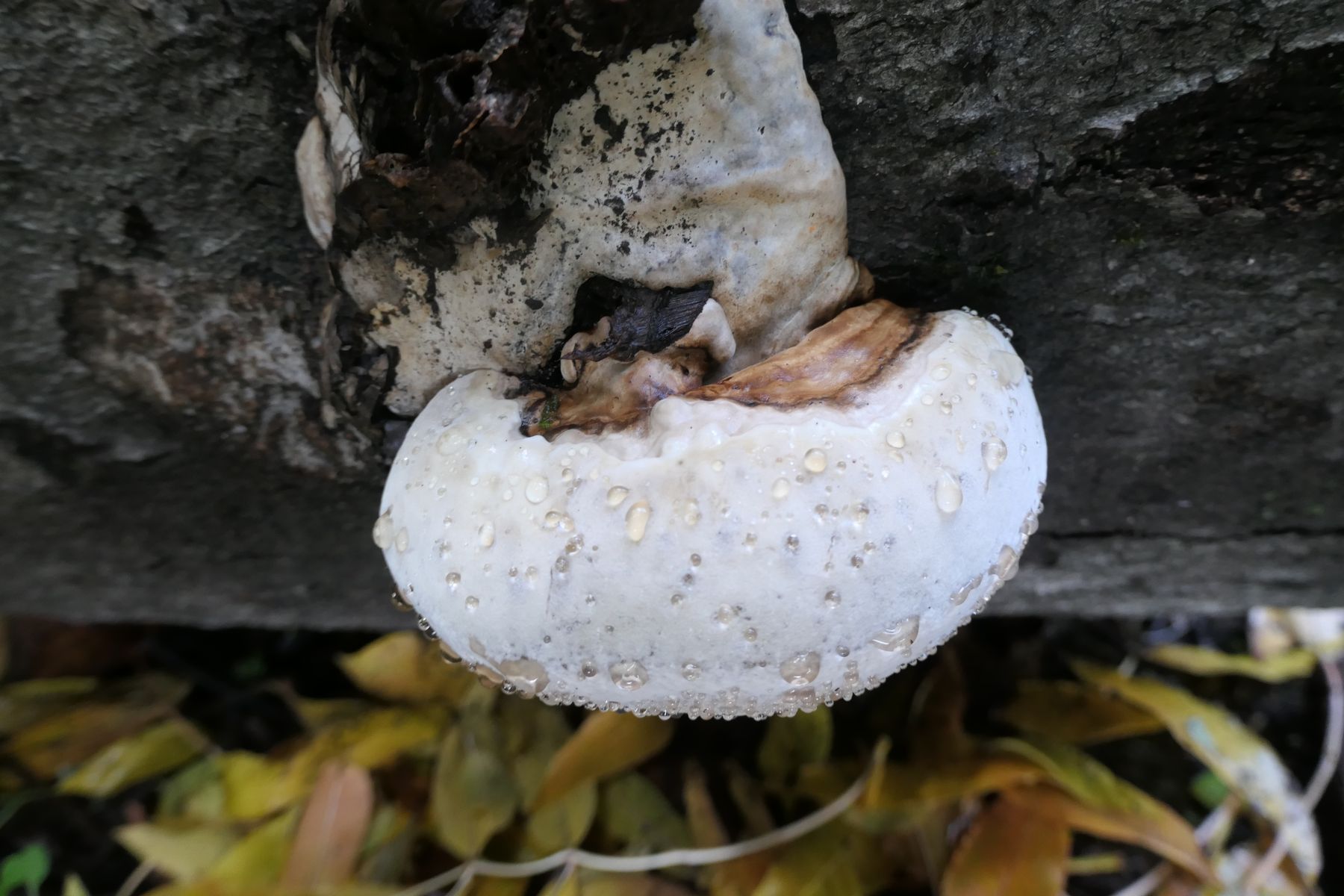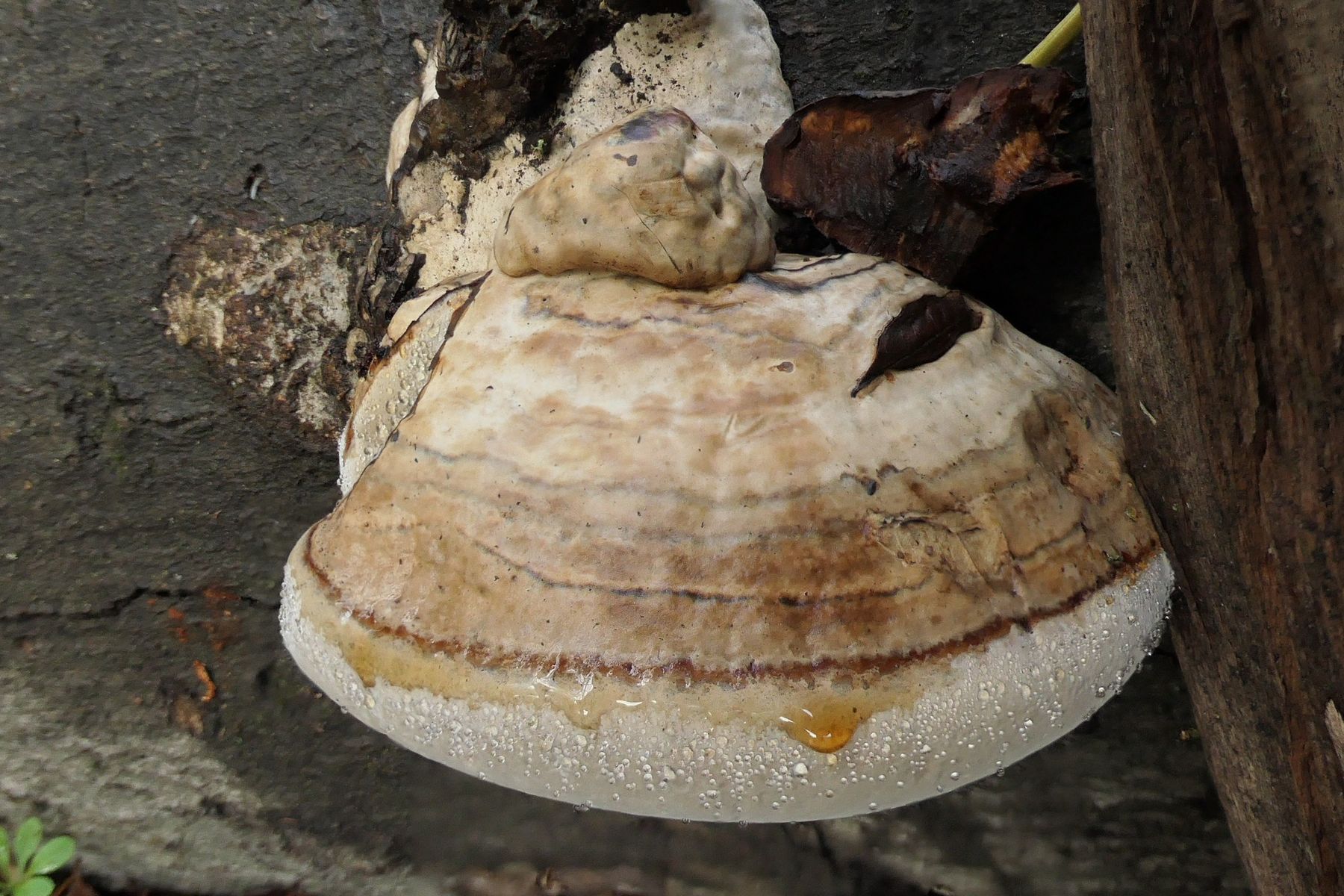 Angesichts des dunklen (braunen) Fleisches im Schnitt und wegen der Farbe und Struktur des Stückchens Hutkruste, die zu erkennen ist, würde ich das eher für einen Lackporling halten. Vom Gesamterscheinungsbild und der Wuchsweise ausgehend am ehesten der Flache (Ganoderma applanatum).Mit solchen Guttationstropfen habe ich den zwar noch nicht gesehen, aber diese verhaltensweise bei diversen Porlingsarten schon beobachtet, wo das eher nicht bekannt ist. zB bei Zunderschwämmen (FomFom).