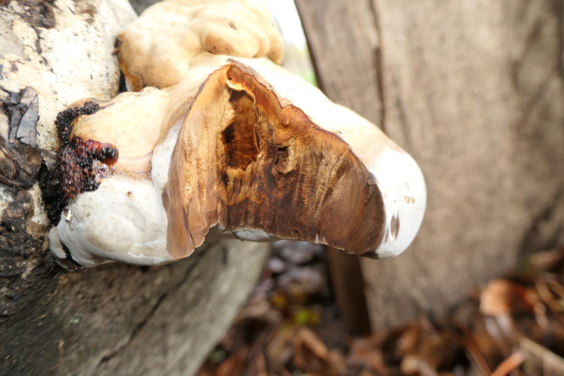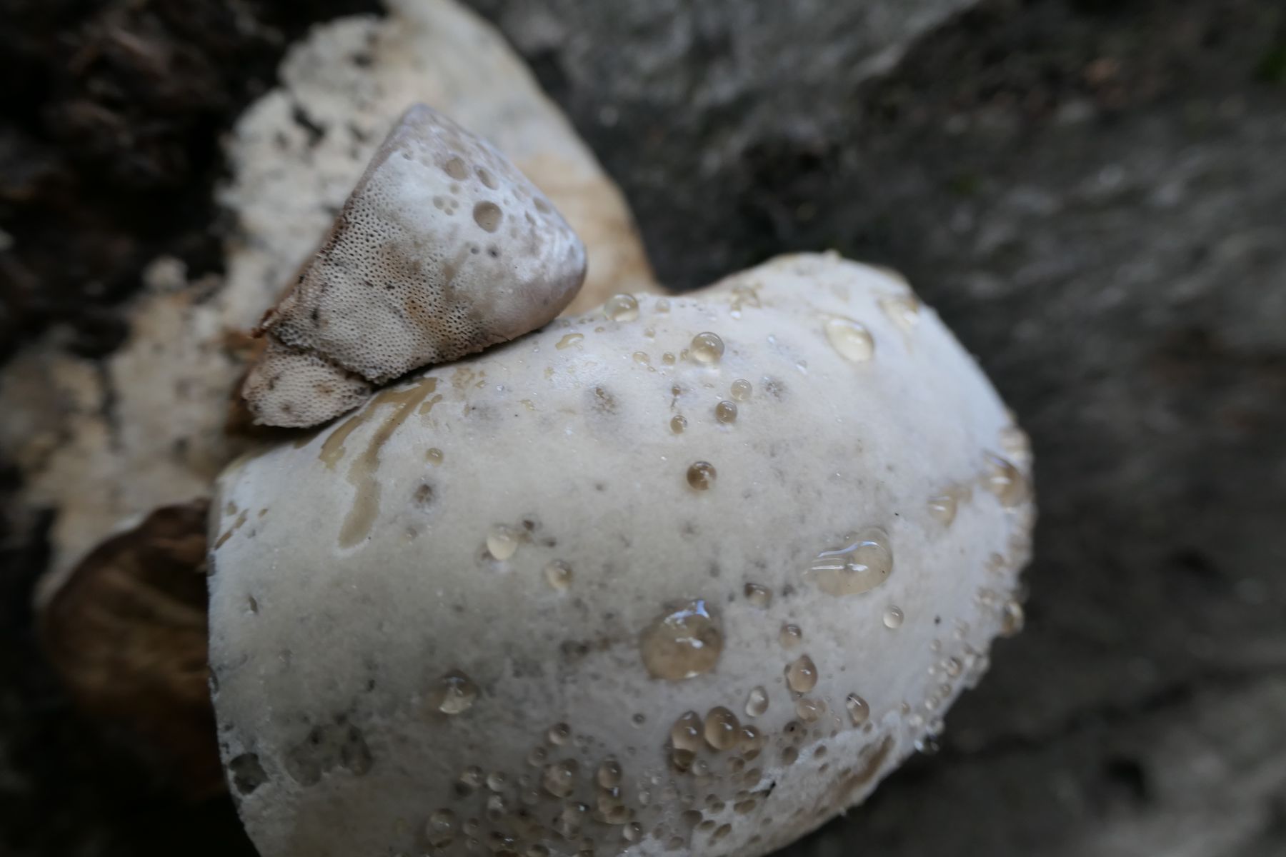 Wegen der Zonierung der Hutkruste mit diesen dünnen Wellenlinien würde ich doch eher auf Zunderschwamm (Fomes fomentarius) umschwenken. Wie oben schon erwähnt hatte ich von der Art auch schon Funde mit vergleichbarem Verhalten (Guttationstropfen), zudem scheint sich da im Anschnitt anzudeuten, daß ganz hinten in Substratnähe durchaus ein mycelkern eingebettet sein könnte.