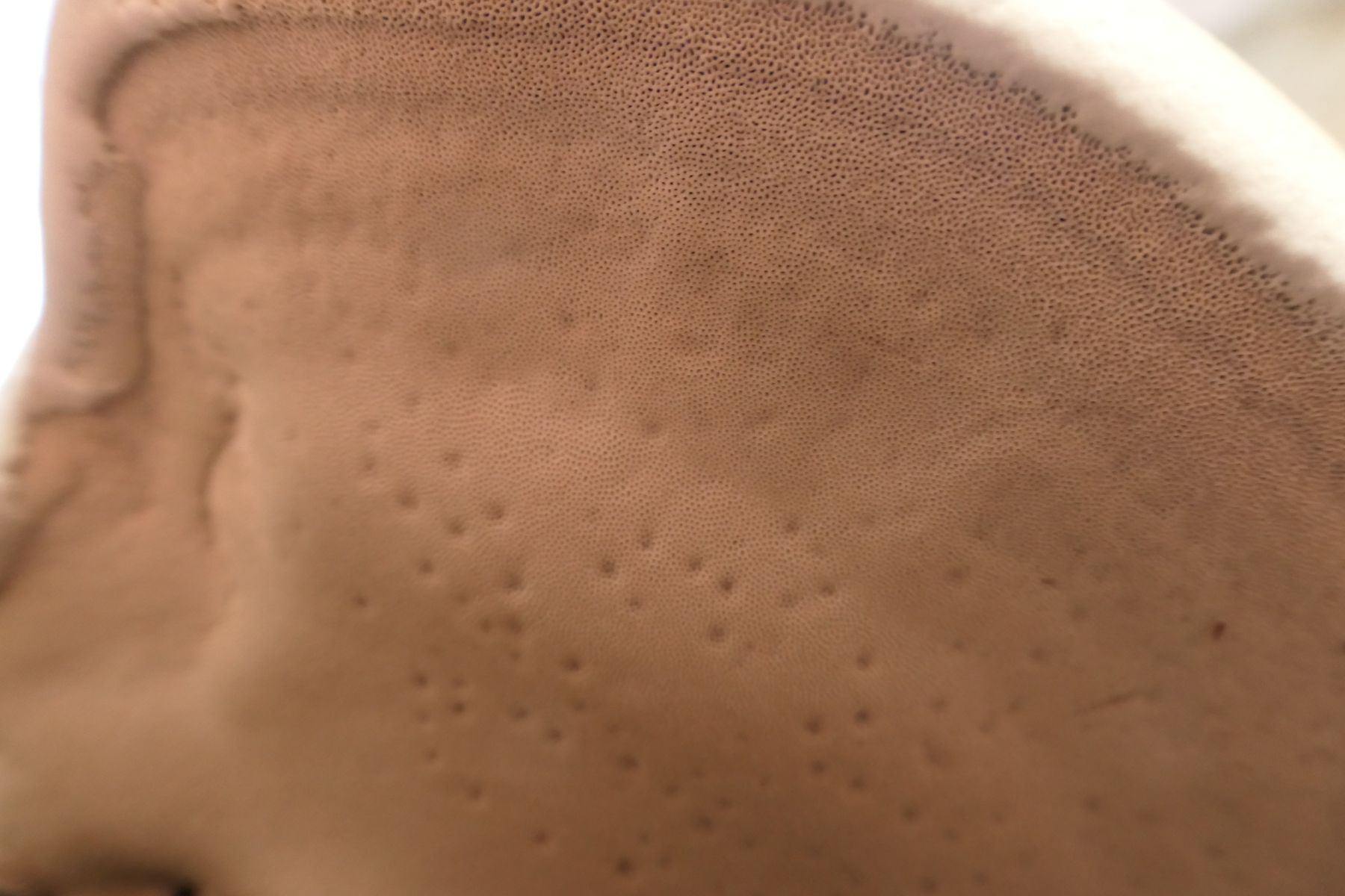 Das Gelb in der Wachszone fehlt, aber feine runde Poren und und ockerbraunes, korkiges Fleisch: Rotrandiger Baumschwamm
