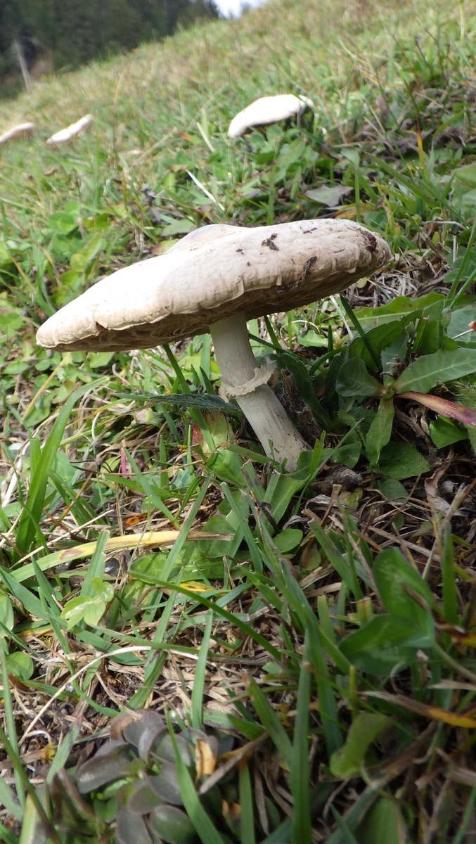 2) Auf eine Rinderwiese auf 1300m wuchsen diese alten trockenen Egerlinge, die Hutmusterung verwirrt mich, die Lamellen waren nicht rosa wie bei Wiesenchampignons