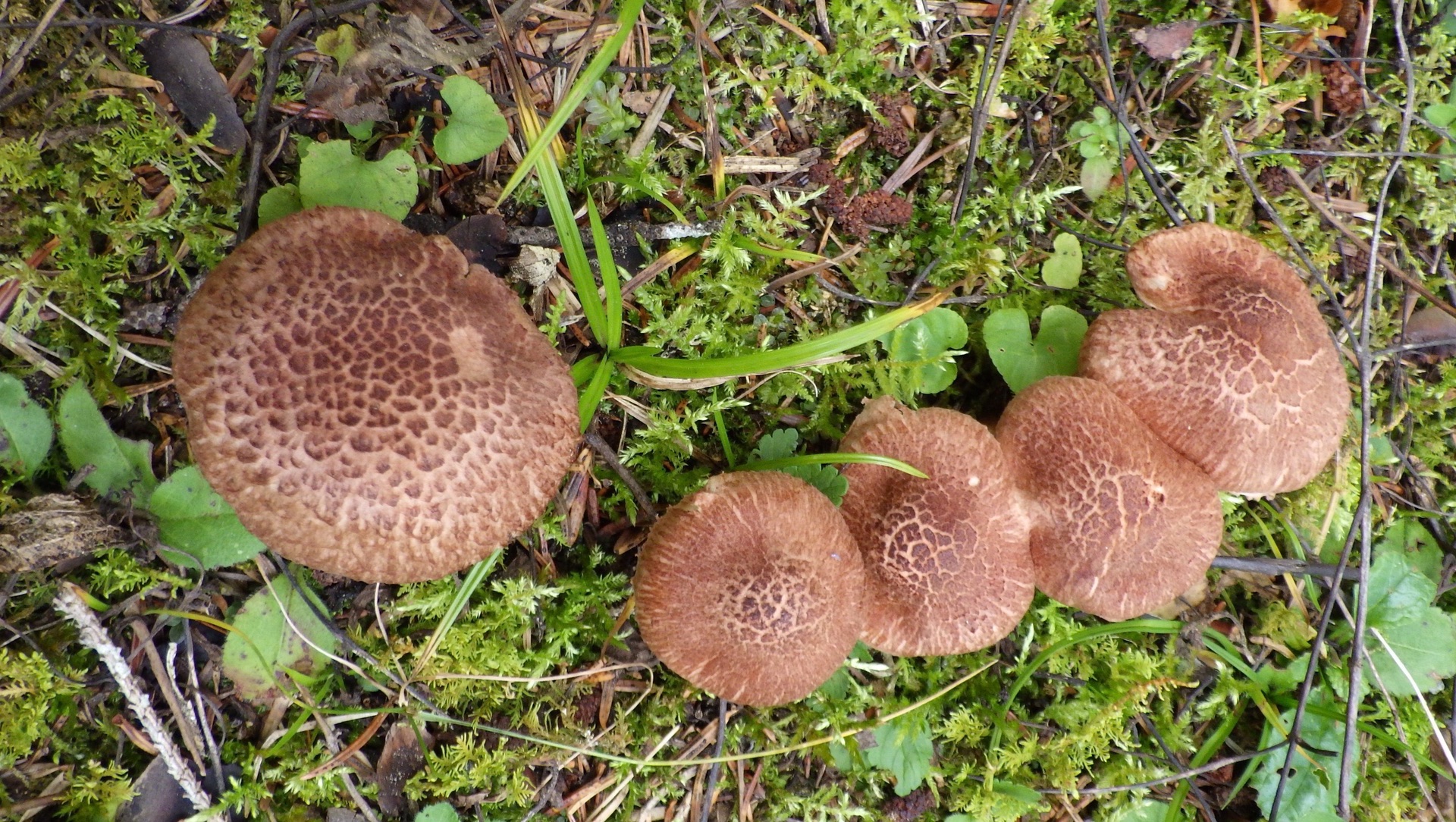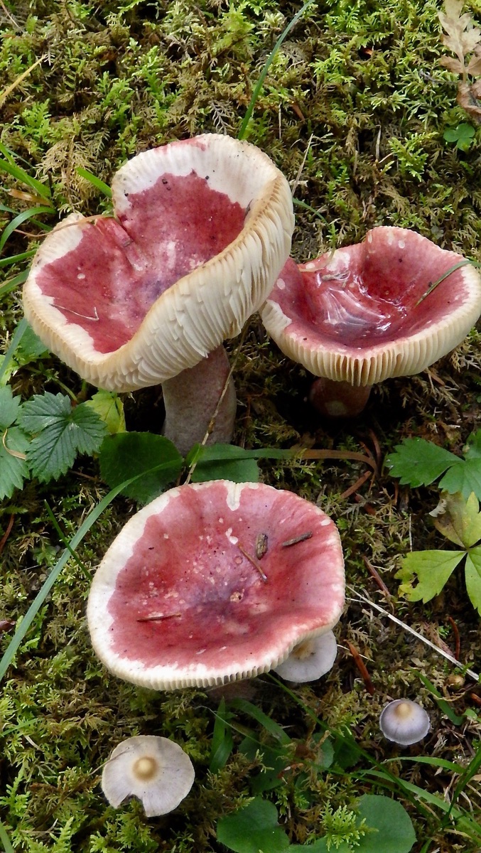5) Oben Stachelbeer-Täublinge, Geschmacksprobe war scharf und der Stiel rötlich, unten die kleinen gebuckelten blauen Pilzchen (Hut nur <2cm) sind mir unklar!
