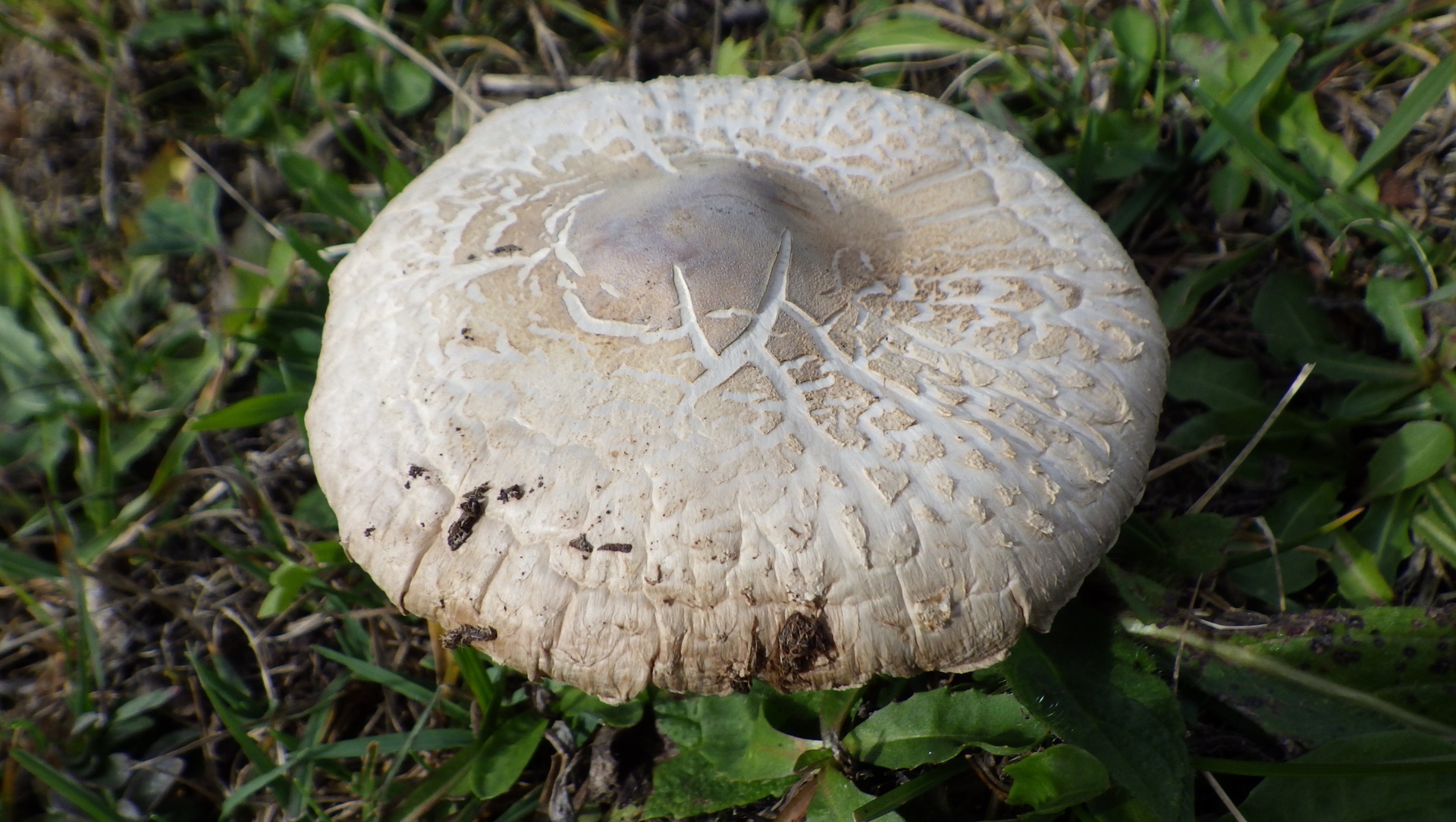 2) Auf eine Rinderwiese auf 1300m wuchsen diese alten trockenen Egerlinge, die Hutmusterung verwirrt mich, die Lamellen waren nicht rosa wie bei Wiesenchampignons