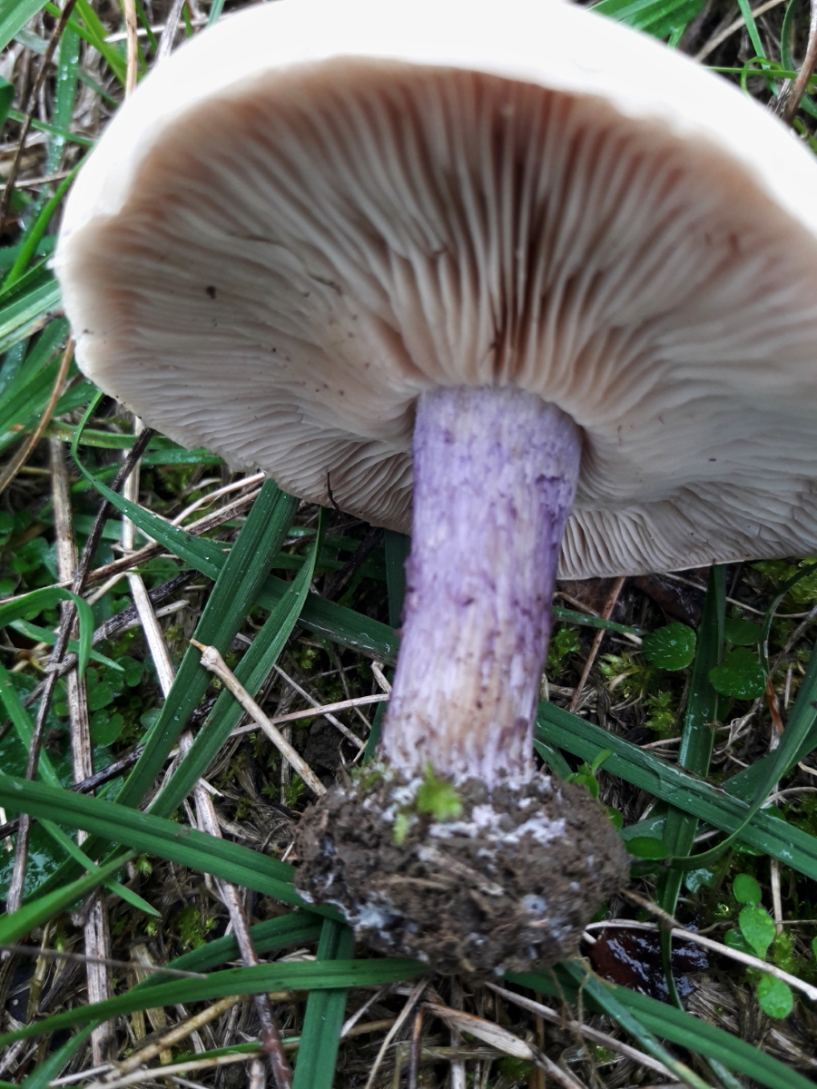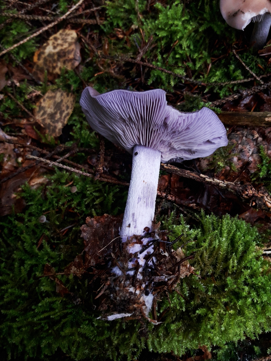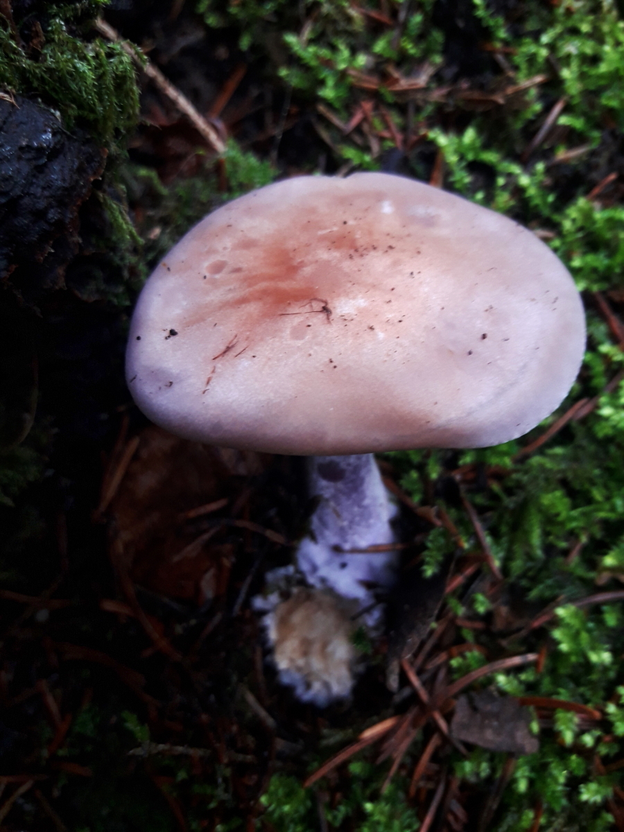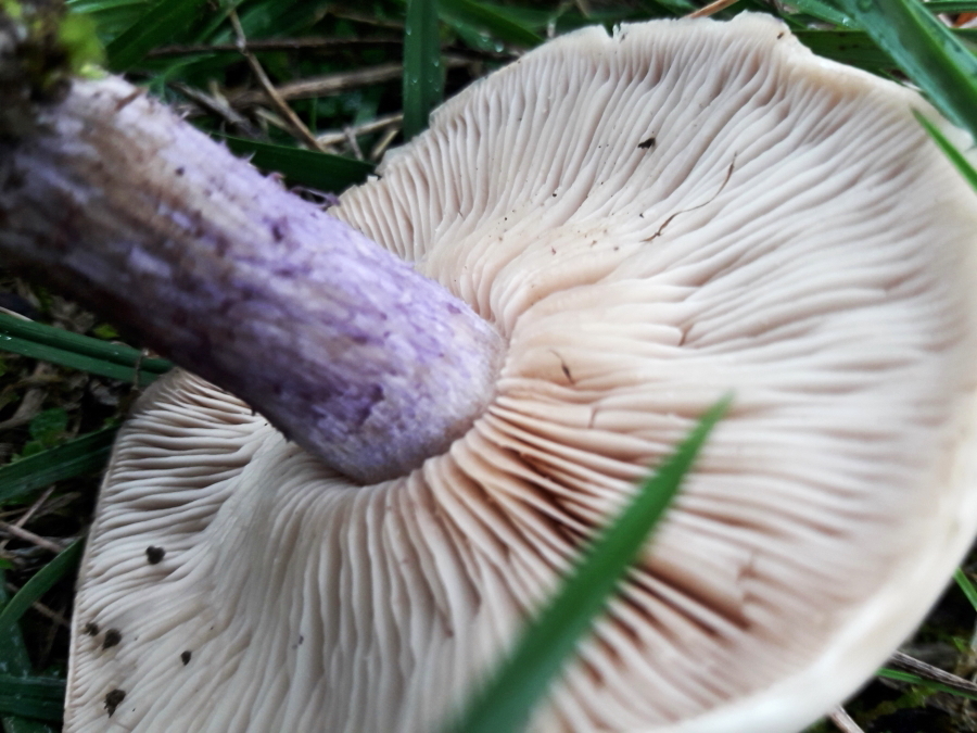 1. Rötelritterling, der Stiel ist schön lila, Hut und Lamellen nur sehr wenig. (Vielleicht der lilastielige Rötelritterling)