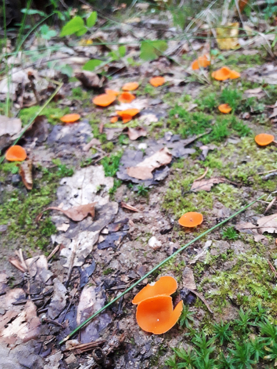 Nr. 5 begegnet mir in letzter Zeit öfter, immer dort wo der Harvester den Boden verdichtet hat wächst dieses orangene Becherchen auf dem Boden.