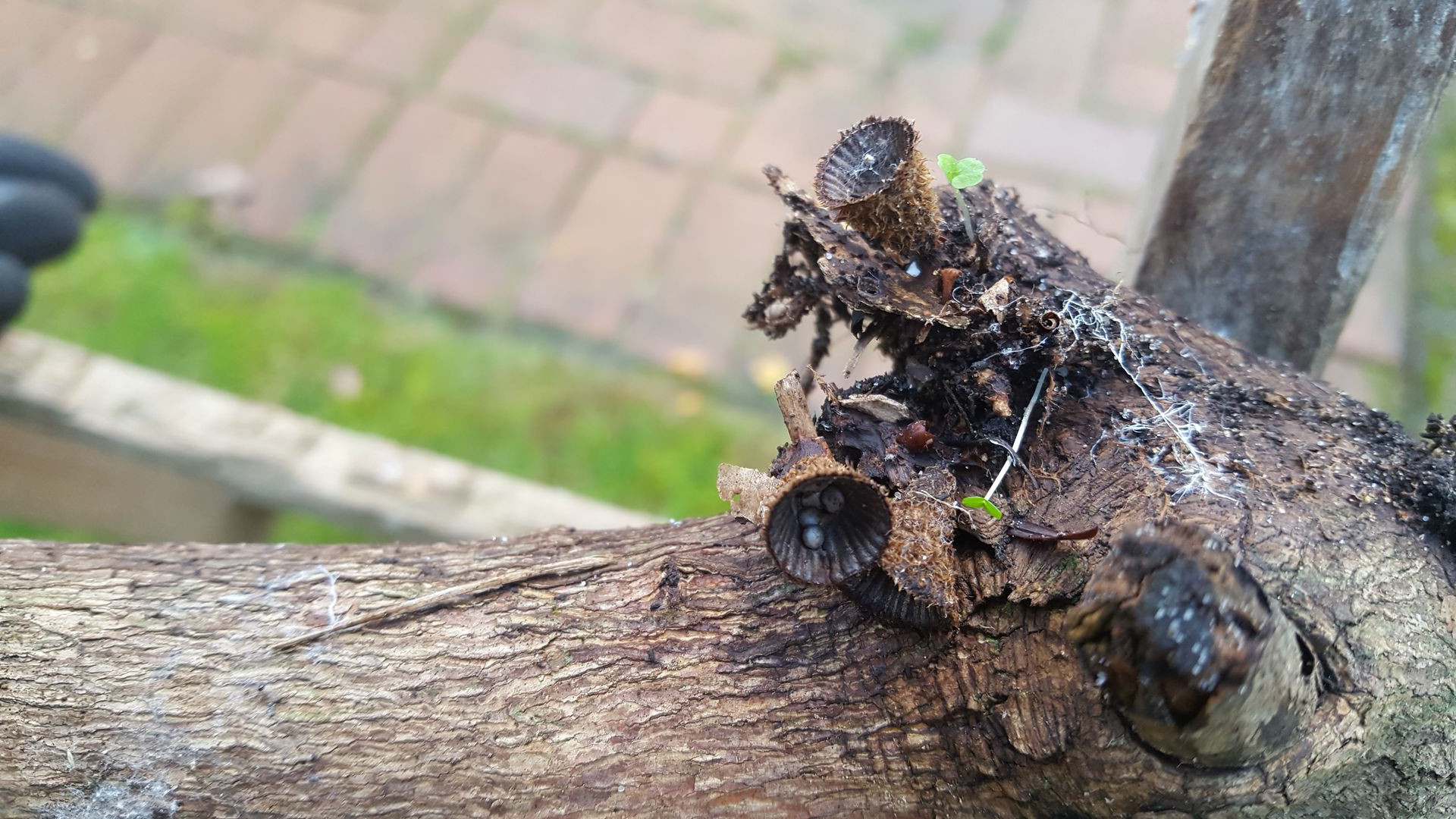 Dazu noch dieser Fund auf einem Rhododendronast, wobei ich da wohl schon selbst drauf komme (Cyathus striatus).