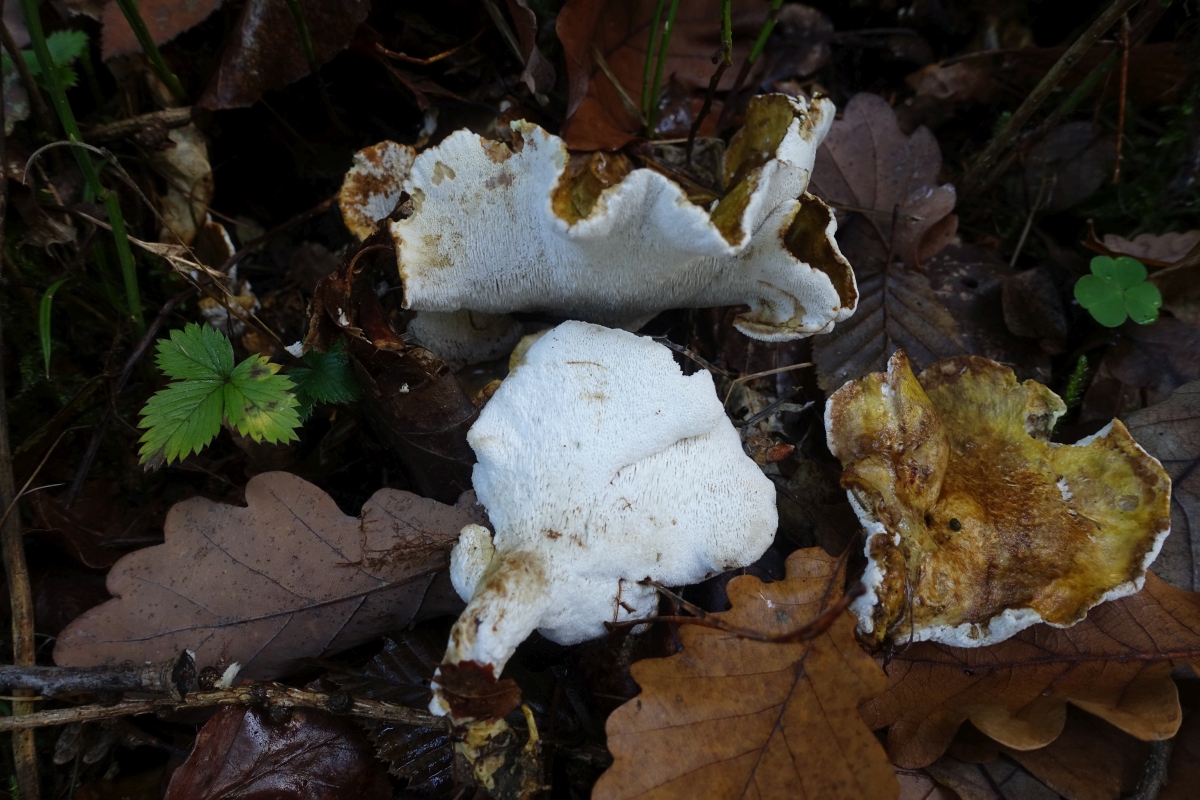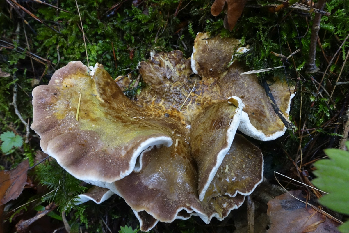 gestern fand ich in einem eher sauren Mischwald einen mir unbekannten seitlich gestielten Porling. Der Hut ist sehr dünnfleischig und zäh. Die Hutoberfläche hat auffälliges einen Farbenspiel: in der mitte ockerbräunlich, grün und gelb wild durchmischt und teils schorfig aufgerissen; am Rand eher weinrölich bis bräunlich. Die Porenschicht ist reinweiß. Der wellig verbogenen Hut geht in einen sehr zähen Stiel über; die Fruchtkörper scheinen büschelig zu wachsen. Einen besonderen Geruch konnte ich nicht feststellen; es gab auch keine Farbveränderungen. Der Fundort war die Böschung einer Frostschutz-geschotterten Forststraße unter Kiefern, aber es gab dort auch Laubbäume wie Pappel und vor allem Buche.