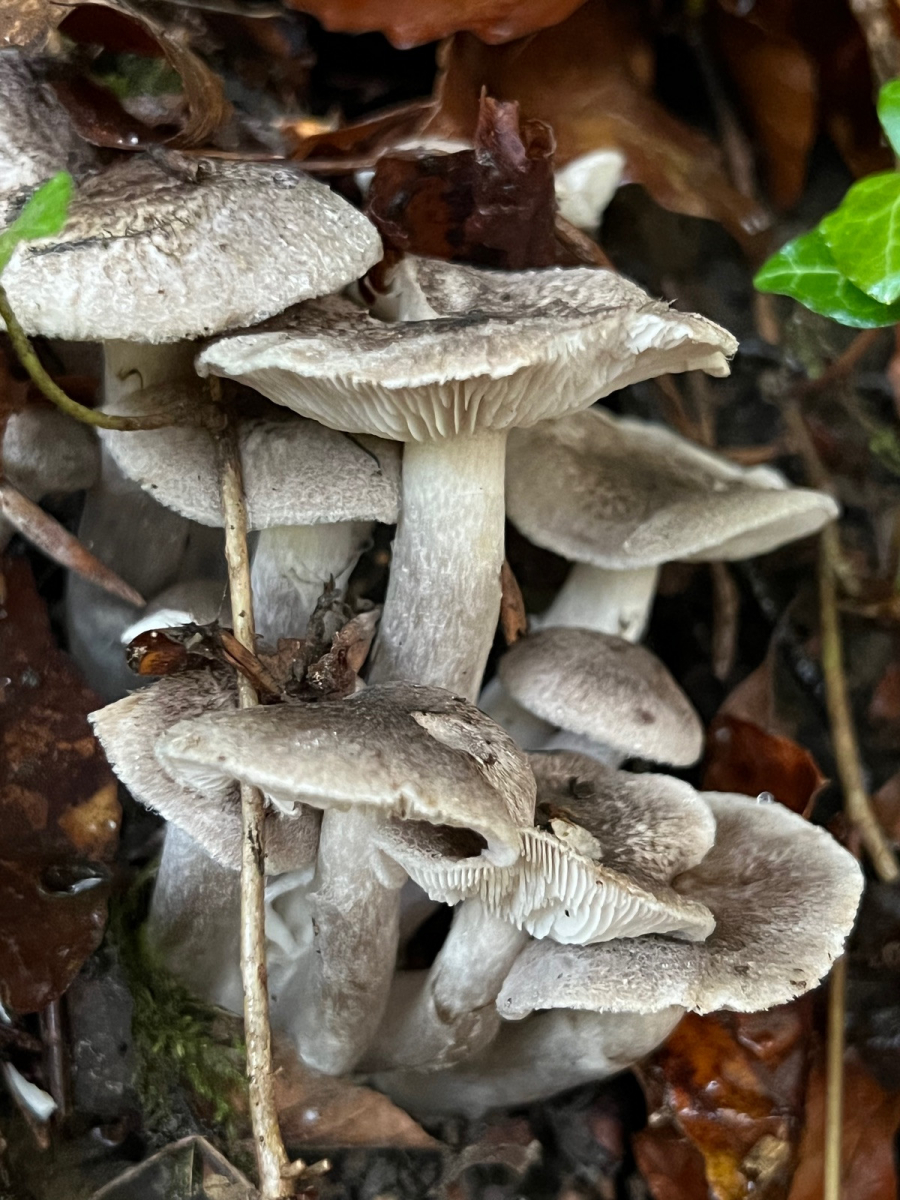 Bei Erdritterlingen ist Geruch des unverletzten Fruchtkörpers und Geschmack wichtig. Ich finde die Stiele etwas düster für Tricholoma terreum (der weder nach Mehl riecht noch schmeckt) und würde eher an eine der Gilbenden Arten, vielleicht sogar an T. Squarrulosum denken.