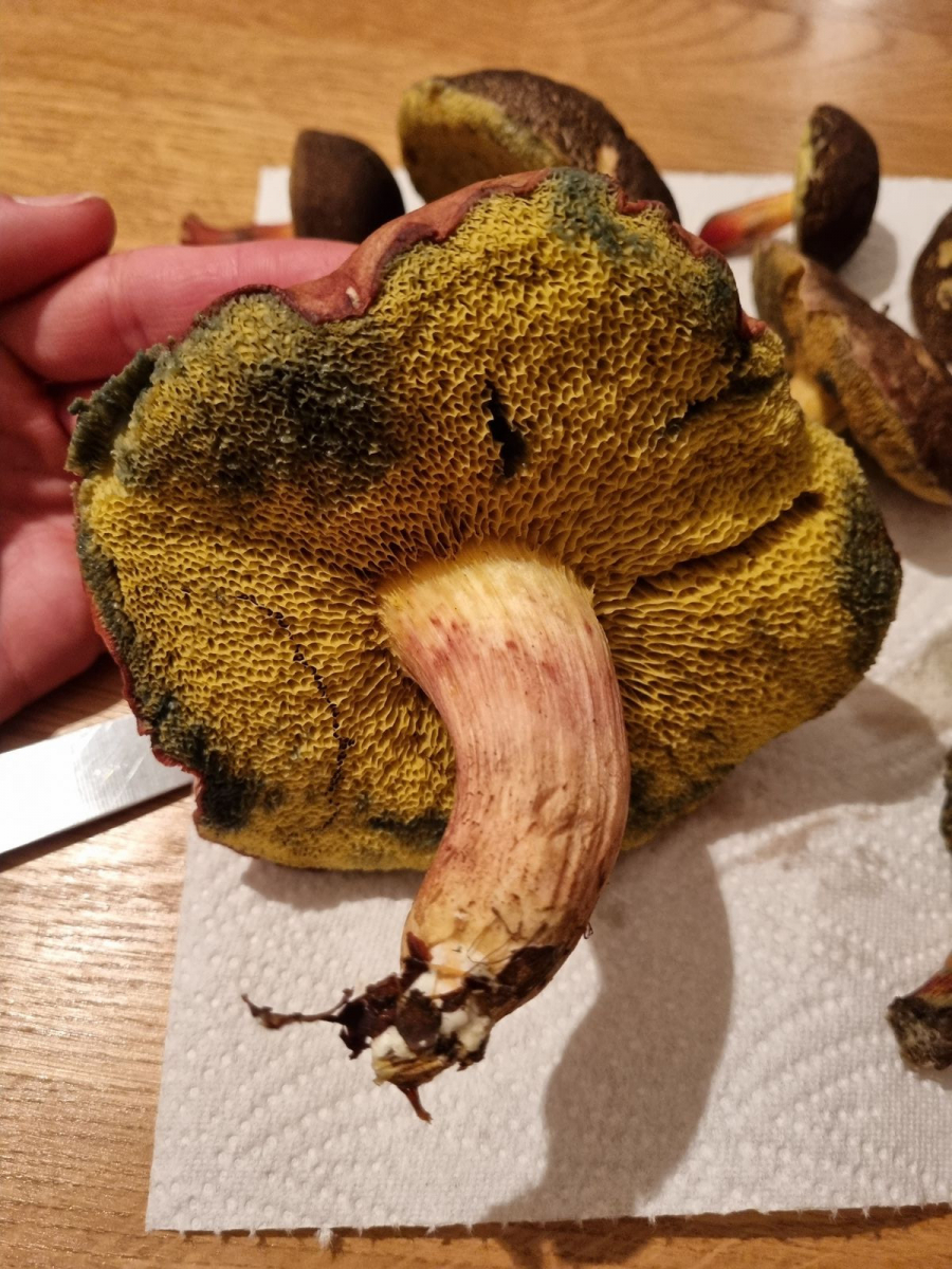 Ideen kamen uns einige, allerdings sind wir uns einfach nicht sicher, was die Große uns da gefunden hat. Beispielsweise der gehämmerte Röhrling zeigt von oben sonst gern eine Marmorierung, die aber ob des üppigen Regens verschwunden sein kann. Auch die leichte Rötung konnten wir (noch) nicht beobachten.