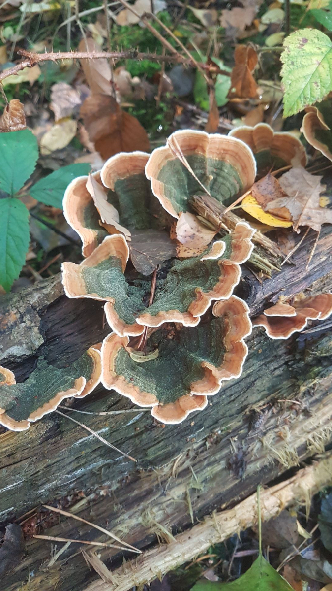 Dreh mal einen von denen um. Das sind Schichtpilze, denn die Unterseiten sind glatt. Keine Poren vorhanden, also keine Schmetteringstrameten.