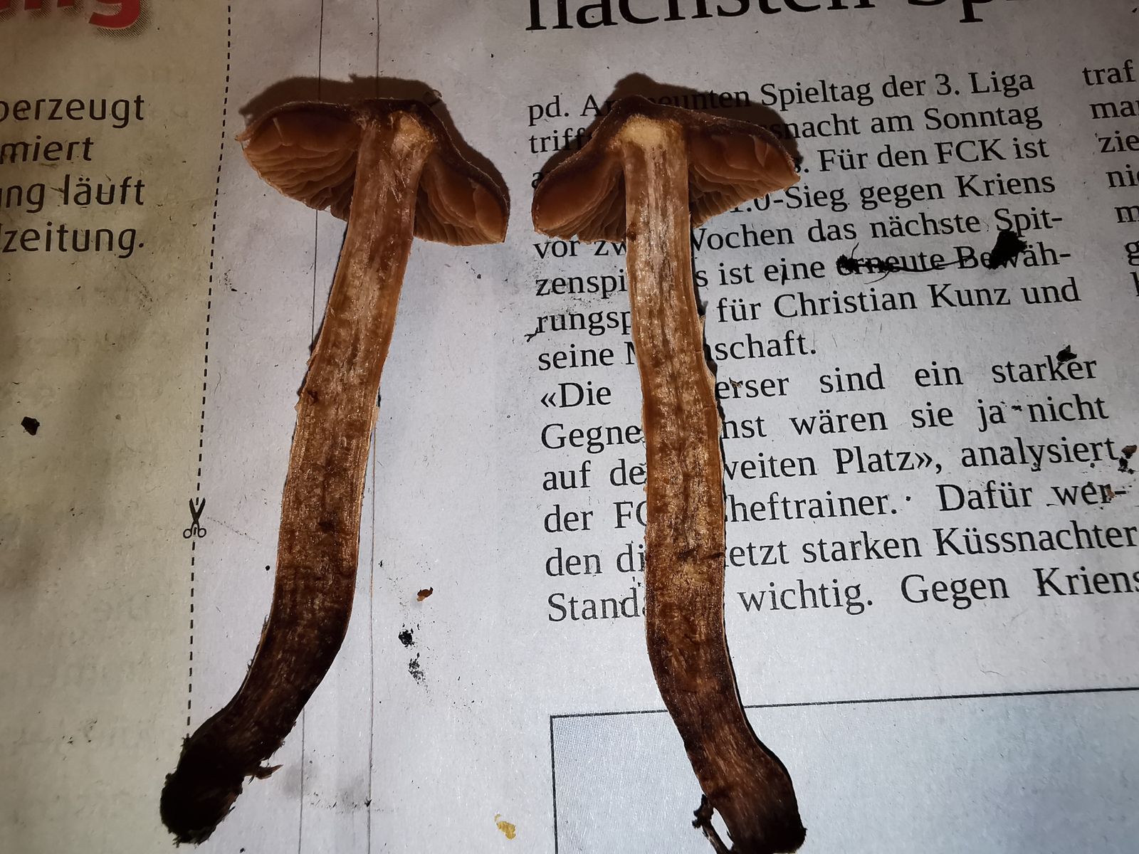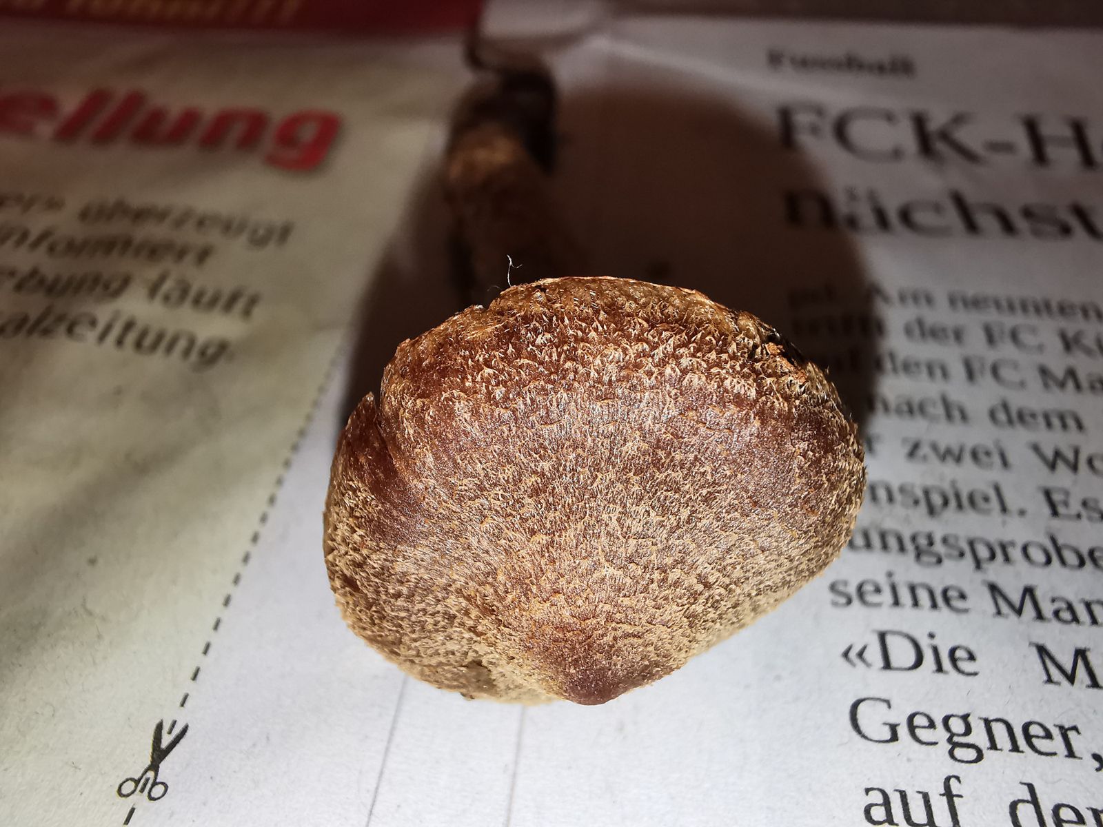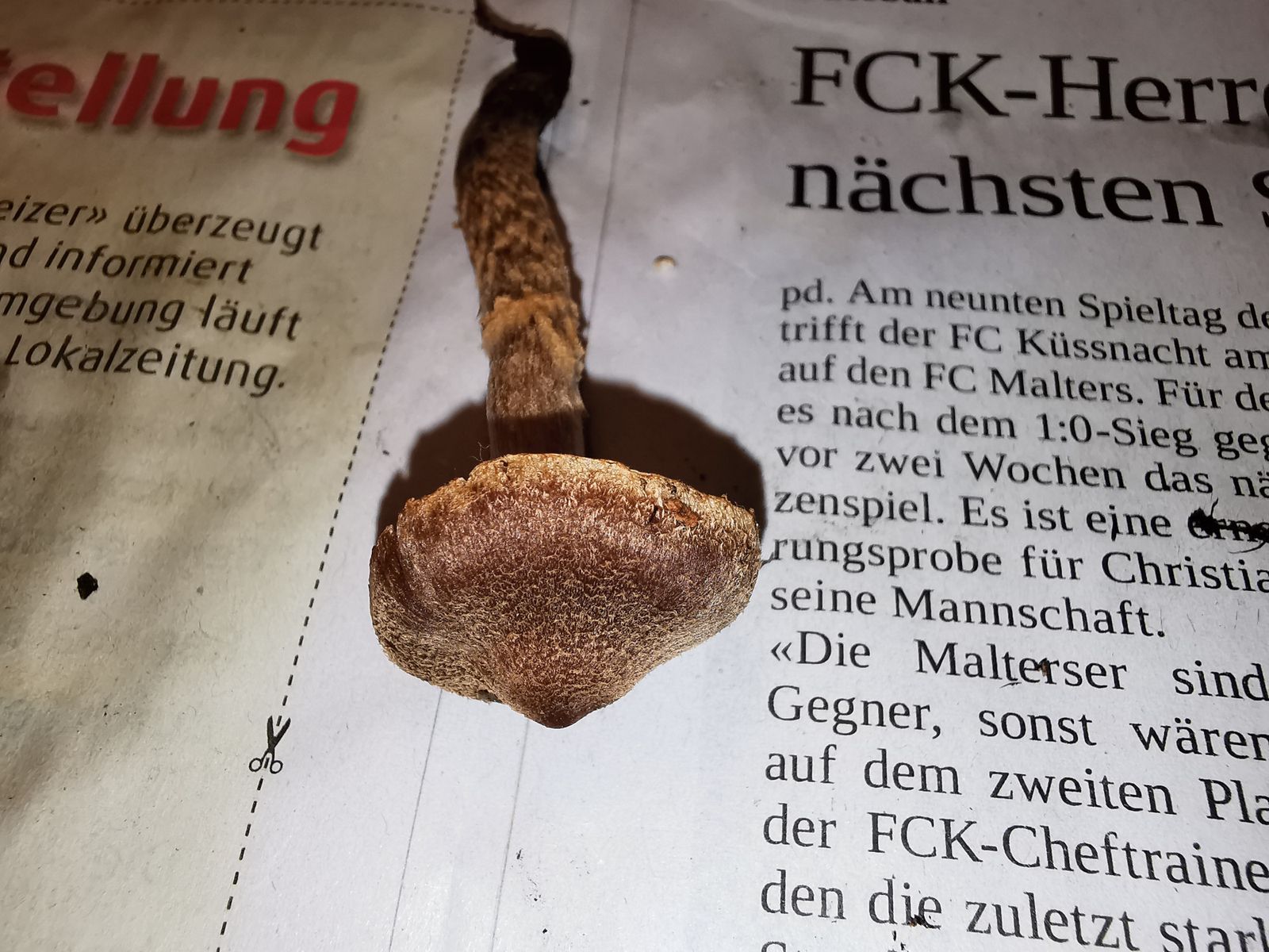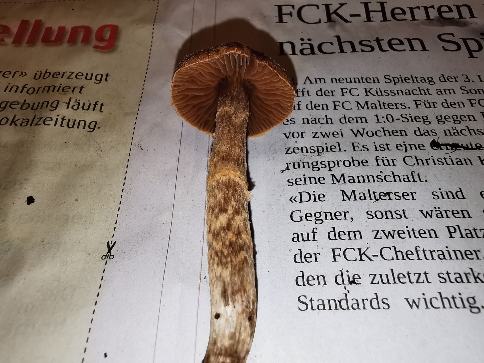 Ich war heute in der Zentralschweiz unterwegs und habe unter anderem einen interessanten Gürtelfuss gefunden. Gefunden habe ich den Pilz bei Tannen, Fichten und Buchen auf etwa 500m. Der Hut ist spitzgebuckelt, dunkelbraun mit ockergelben Schüppchen bedeckt. Der Stiel ist graubraun (Untergrund dunkelbraun) mit deutlichem blassgelben Velum natterig gebändert. Das Fleisch ist zuerst dunkelbraun, nach einer Weile graubraun. Den Geruch empfinde ich als neutral. Mit dem Schlüssel von G. Kibby bin ich zu Cortinarius angelesianus - Strubbeliger Gürtelfuss gekommen.