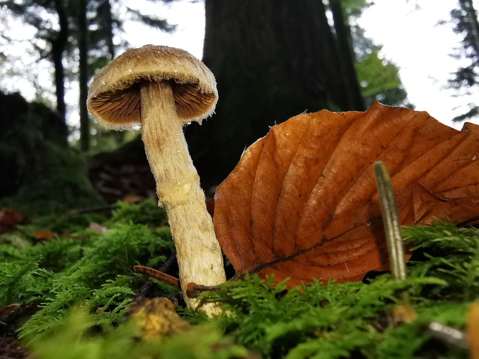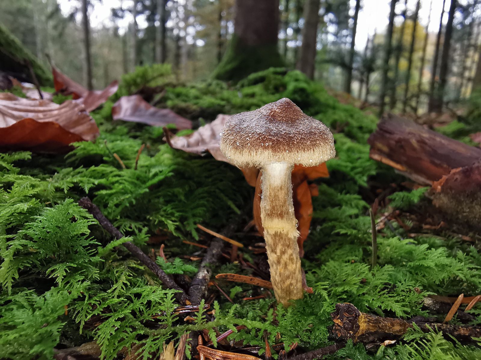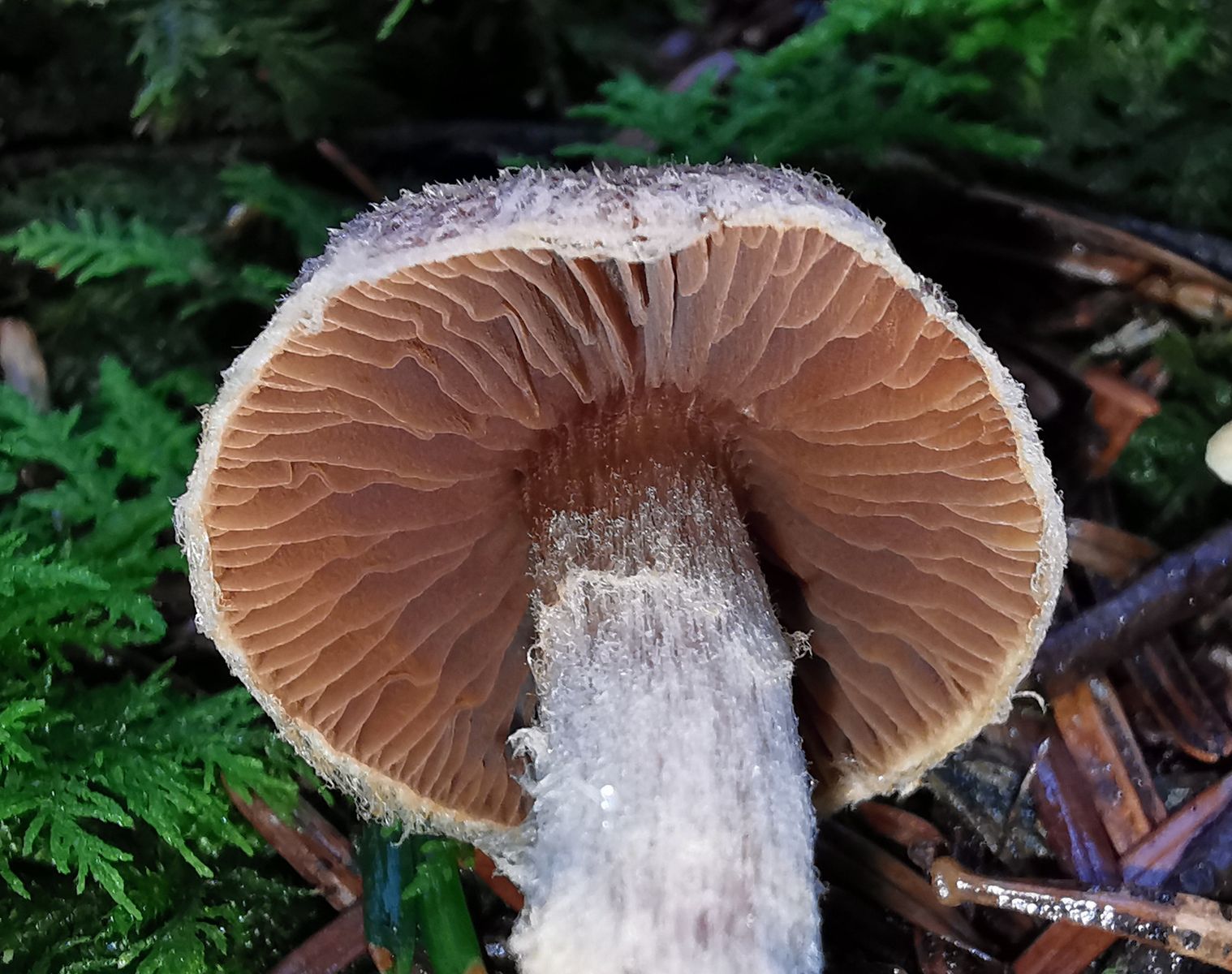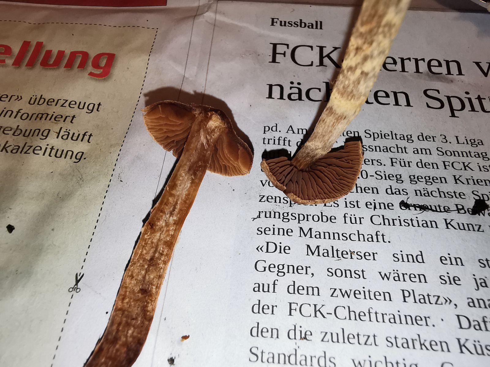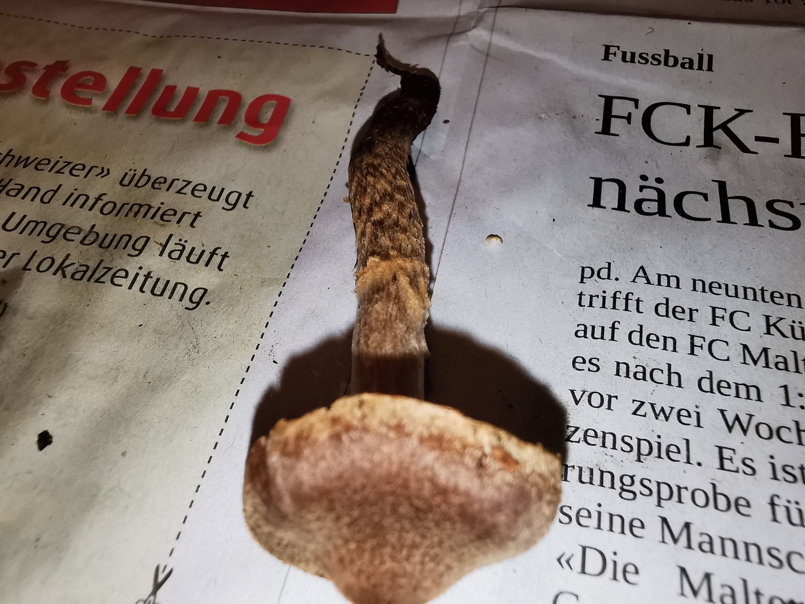 Ich war heute in der Zentralschweiz unterwegs und habe unter anderem einen interessanten Gürtelfuss gefunden. Gefunden habe ich den Pilz bei Tannen, Fichten und Buchen auf etwa 500m. Der Hut ist spitzgebuckelt, dunkelbraun mit ockergelben Schüppchen bedeckt. Der Stiel ist graubraun (Untergrund dunkelbraun) mit deutlichem blassgelben Velum natterig gebändert. Das Fleisch ist zuerst dunkelbraun, nach einer Weile graubraun. Den Geruch empfinde ich als neutral. Mit dem Schlüssel von G. Kibby bin ich zu Cortinarius angelesianus - Strubbeliger Gürtelfuss gekommen.