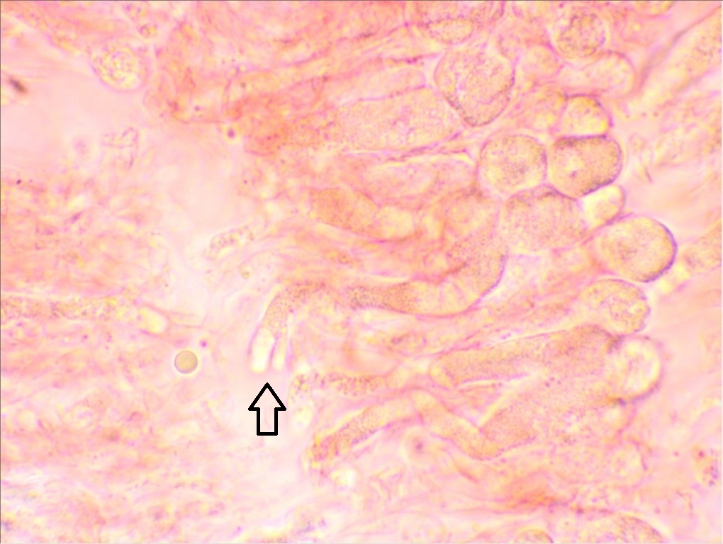 ich denke, dass es sich bei dem obigen Fund um C. falcata = acuta handelt. Die schlanken, rein weißen Frk. mit hyalinem sterilen Teil und Schnallen an der Basis der Basidien sind doch recht typisch. C. krieglsteineri = daulnoye hat cremfarbene mehr keulige Frk. und etwas schlankere Sporen.