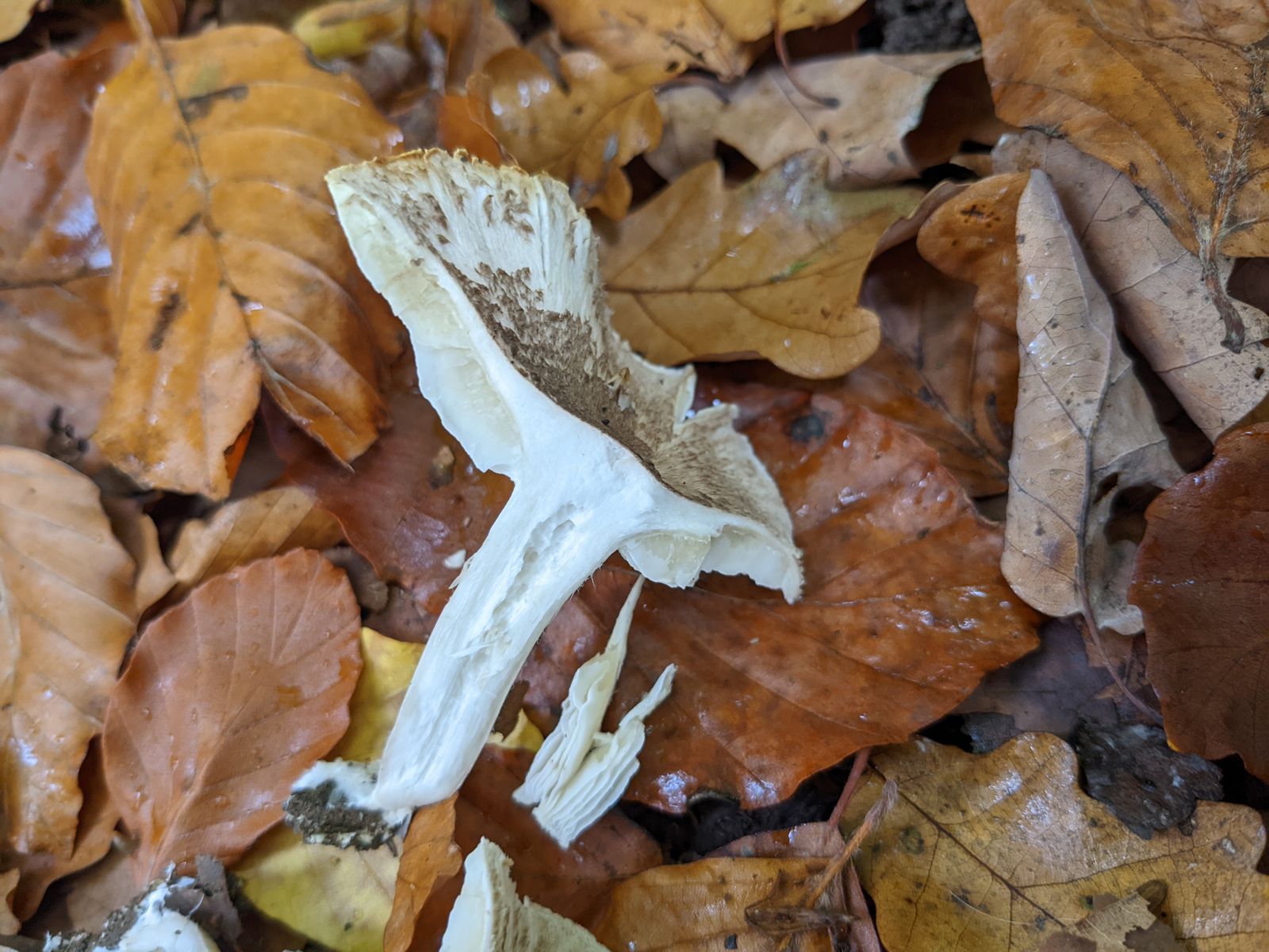 Lamellen: Weiß, wellig/zähnig, gilbend/bräunend an verletzten Stellen. Ausgebuchtet angewachsen, aber auf Grund des schon älteren Fruchtkörpers nicht mehr ganz so gut so ausgeprägt