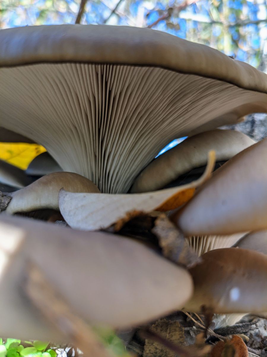 Auf dem ersten Bild sieht man rechts am Stamm auch noch 2 kleine hellere Pilze. Auch Austernpilze? Da hab ich einen abgemacht, weil ich dachte kleiner = frischer, aber der war muffiger, älter und wurde auch gar nicht mitgenommen. Von daher fühle ich mich mit den grauen wohler.