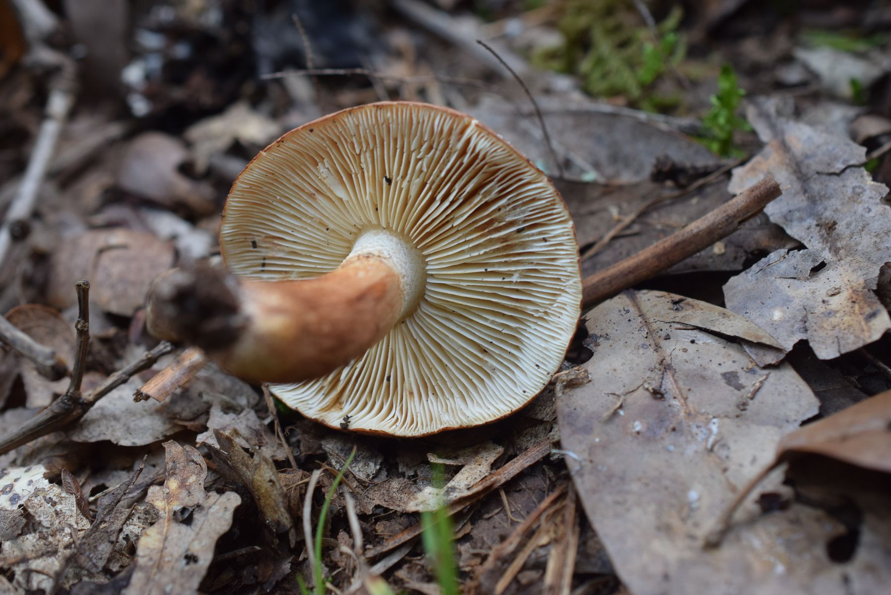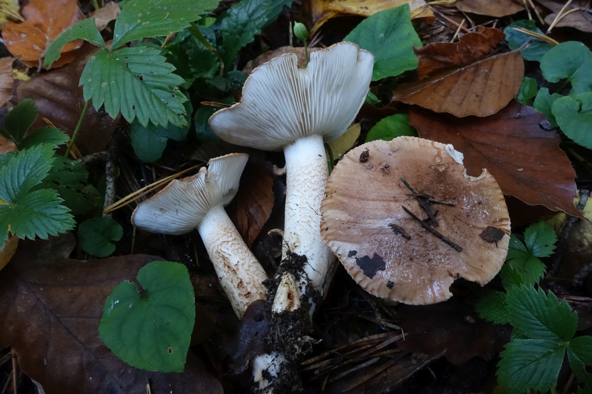 ich fand vor einigen Tagen im Mischwald einen braunen Ritterling. Der Hut ist hellbraun, in der gebuckelten Mitte dunkler, am gerippten Hutrand deutlich heller; Huthaut leicht überhängend. Lamellen weiß, ebenso die Stielspitze. Darunter relativ jäh in eine bräunliche Natterung übergehend, die bis zur Stielbasis reicht. Geruch unauffällig, Geschmack gallenbitter: Zunge an die Huthaut halten reicht bereits, Geschmackstest der Huthaut regelrecht widerlich bitter. Fundort war ein Wegrand an einer Frostschutz-geschotterten Straße unter Buche, Pappel, Kiefer und möglicherweise auch Eiche.