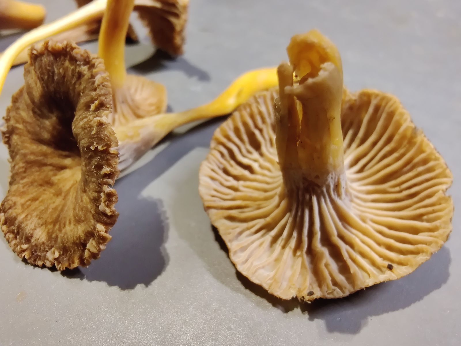 Sehr zahlreich wachsend. Teils Dutzende auf kleinem Raum. Hohler Stiel, klar erkennbare Leisten und Hut mit Loch der fast in den Stiel mündet. Erdinger Geruch.