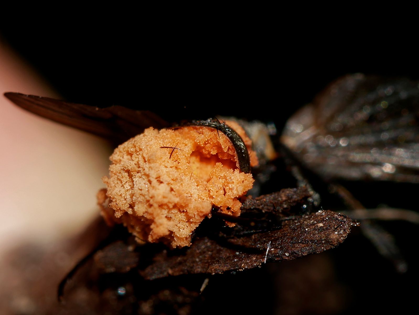 hat von euch schon mal jemand einen Fliegentöter in orange gesehen? Ich kenne als Laie nur den einen Fliegentöter (Entomophthora muscae). Und der ist weiß und samtig. Gibt es da möglicherweise noch mehr Arten? Oder kann das orage Zeugs noch was ganz anderes sein?