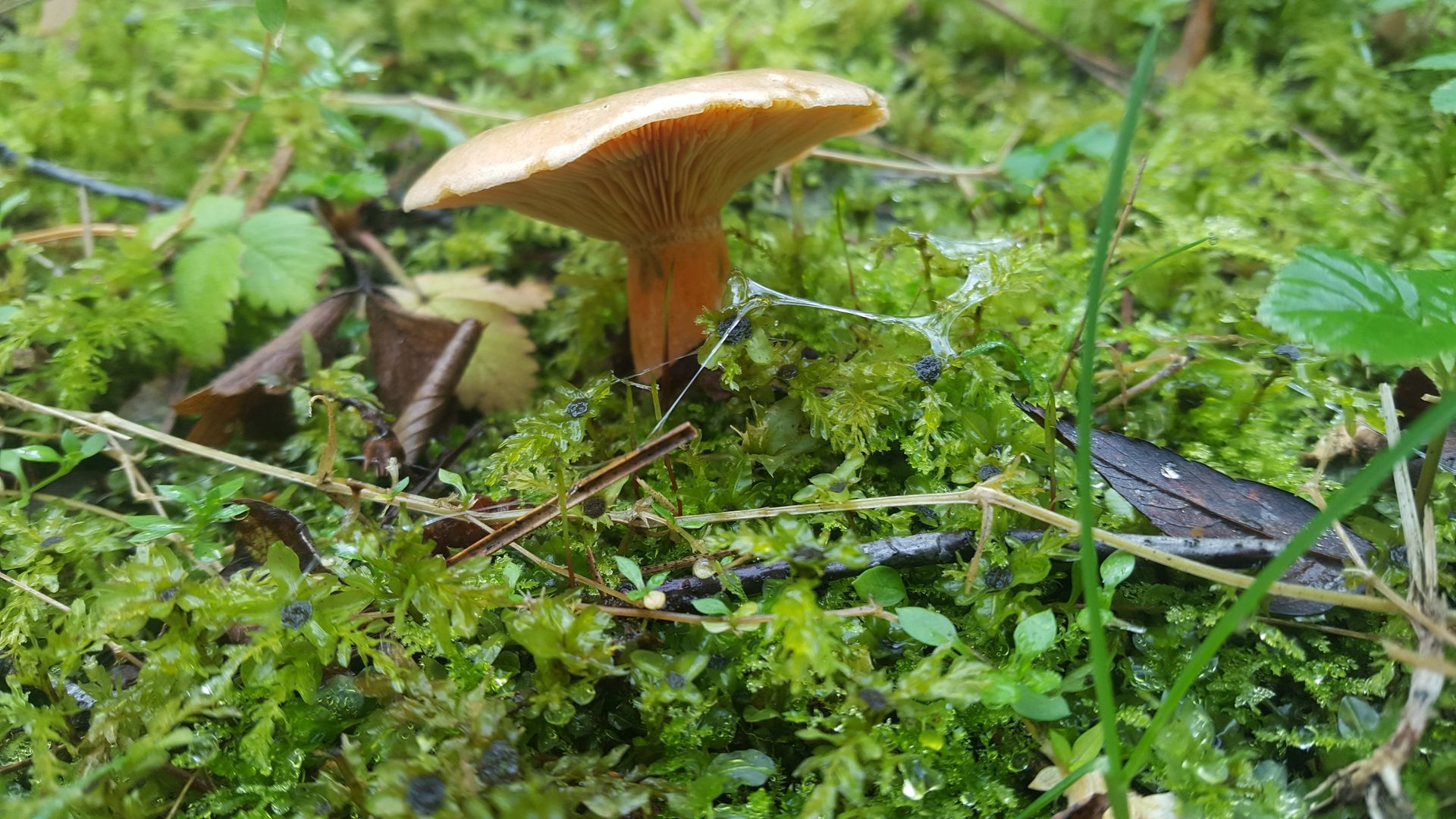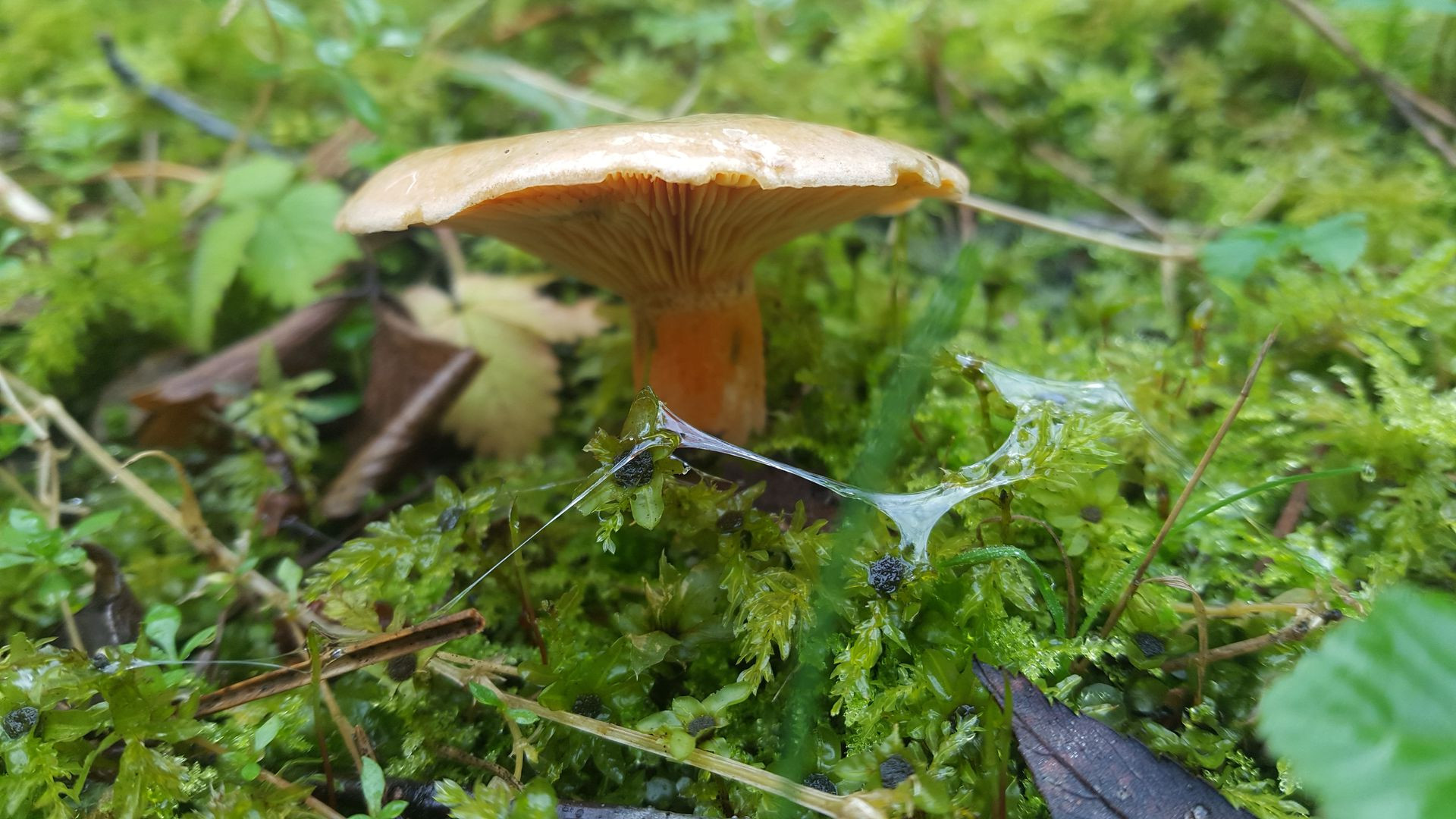 der folgende Pilz wuchs recht langsam an einem Hang. Untergrund, wie man sieht, moosig, in der Nähe Farne, kleine Laubbäume und eine ältere Bergkiefer. Er war erst recht klein und sieht erst nach mehreren Tagen so aus wie auf dem Foto. Es gibt bislang keine Artgenossen in der Nähe. Der Hut ist immer nach Regen recht schleimig, darunter aber glatt-glänzend. Geruch mild-würzig, unauffällig. Auffällig ist das leicht durchschimmernde Grün am Hut. Ich weiß nicht, ob es sich um einen Grünling oder ähnliches handeln könnte.