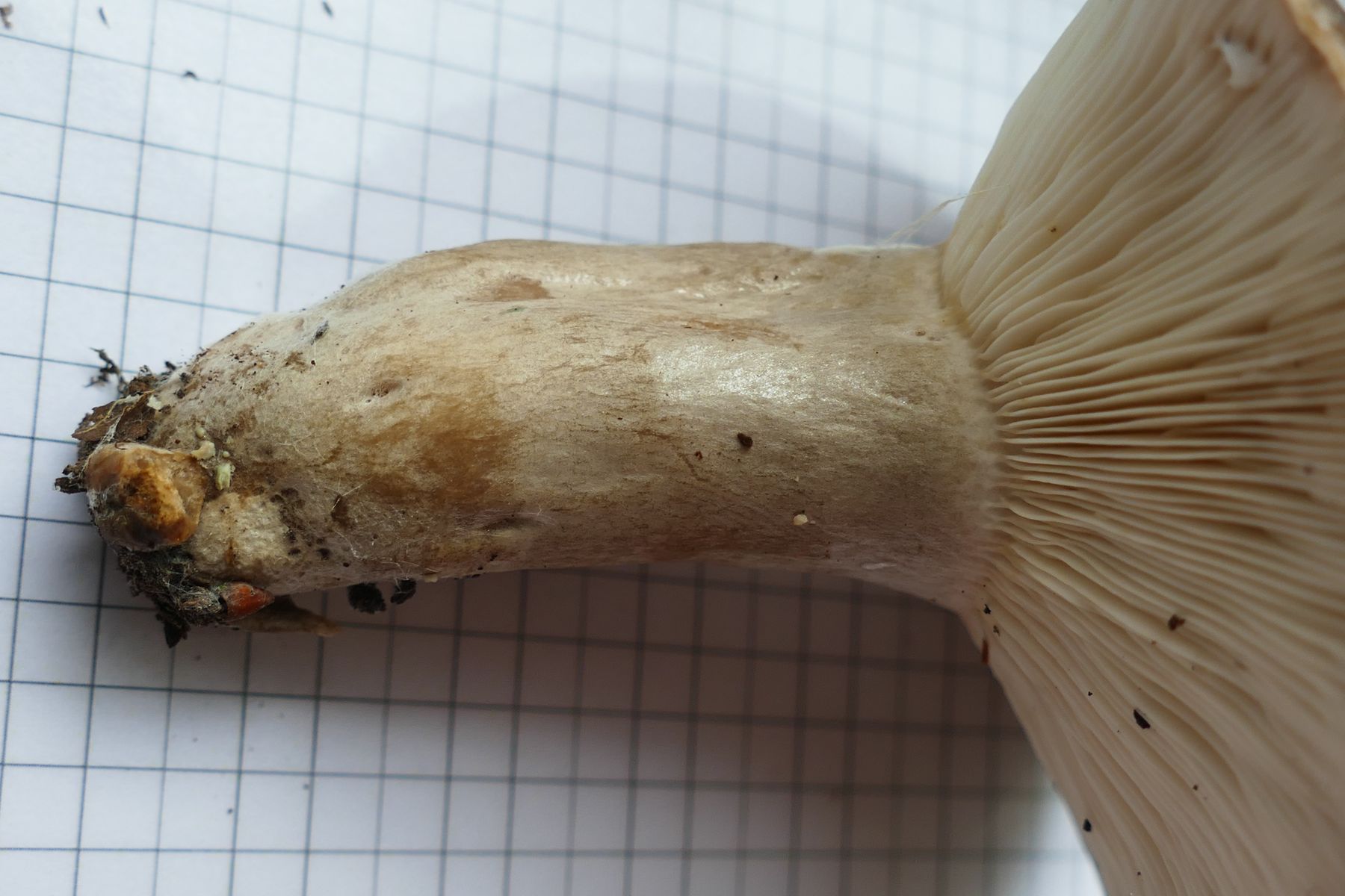 Hut, Stiel und Lamellen fast Ton in Ton hellbraun.