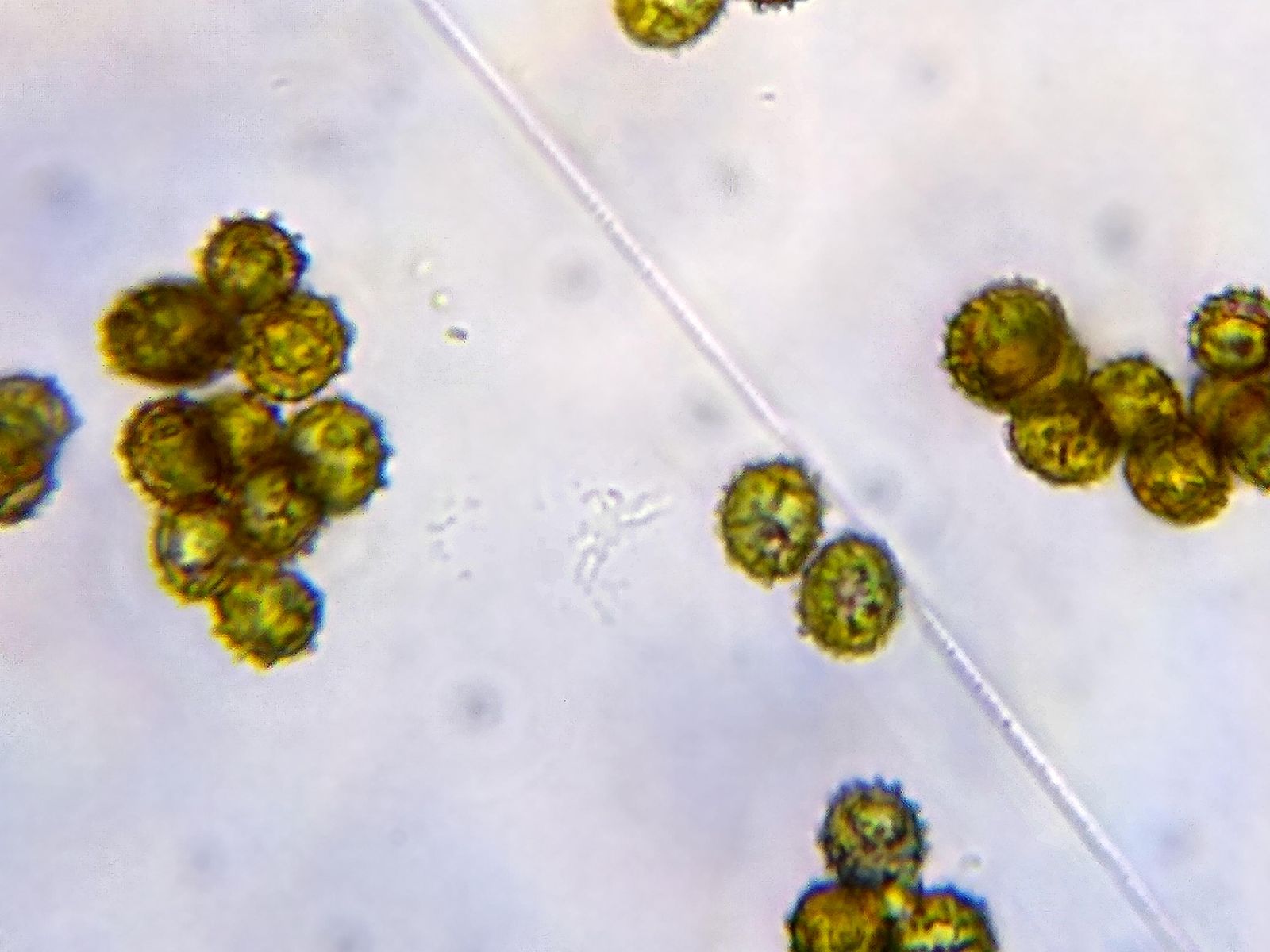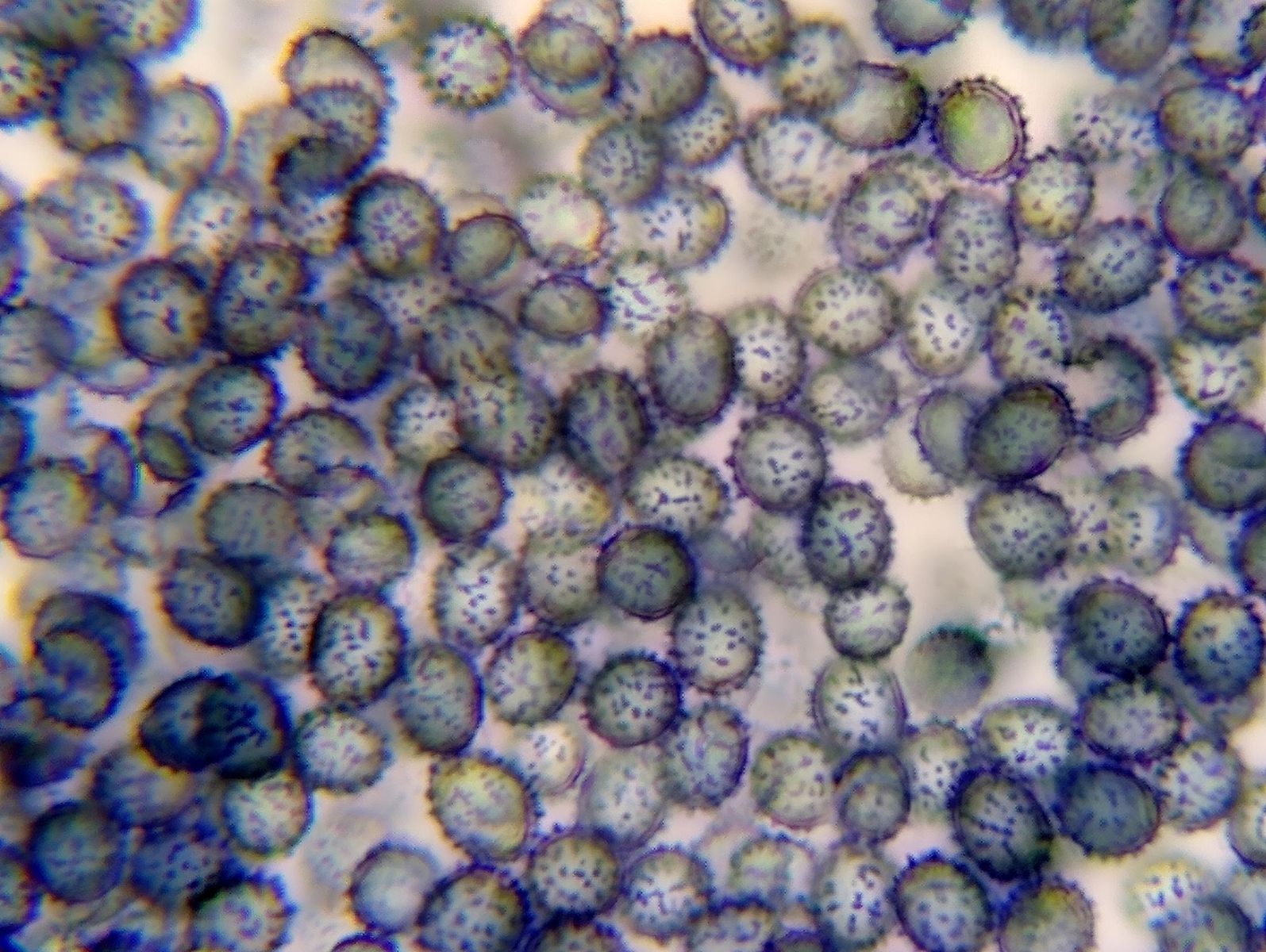 Die Sproren habe ich nach dem Abwurf mit einer ordentlichen Menge Lugol (2-3 Portionen aus dem Spatelfläschchen auf das Deckblättchen) versetzt und zusätzlich mit dem Feuerzeug erhitzt.