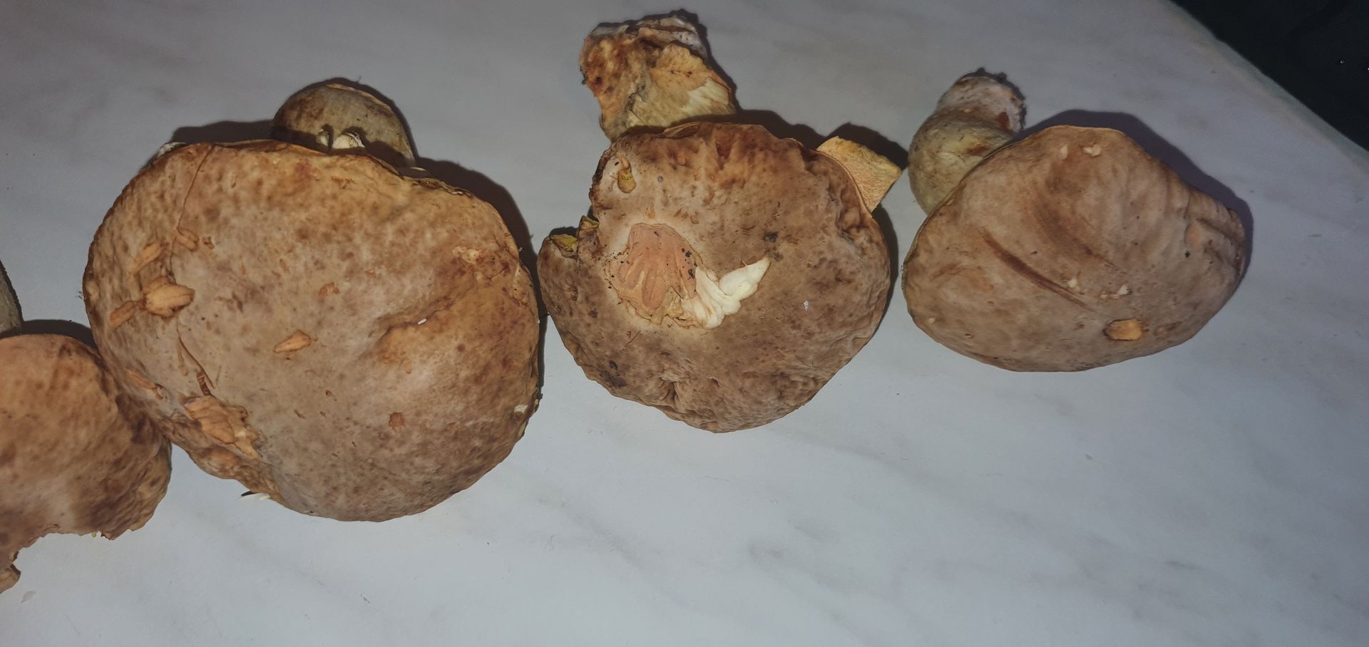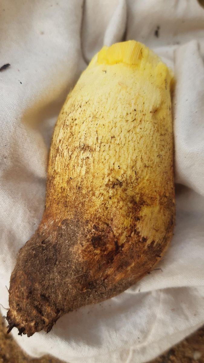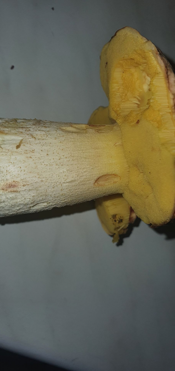 Sie haben nicht im geringsten geblaut und weitgehend nicht gerötet, ein leichter Schimmer orange fand sich an einer älteren Bruchstelle an den Röhren und das Stielfleisch veränderte sich nach längerer Zeit im Mittelteil leicht Richtung rotbraun. Insgesamt wirkten in natura Stiel, Stiel- und Hutfleisch noch deutlich gelber - abgesehen vom Detailfoto des Stiels, das später bei anderem Licht aufgenommen wurde und die Gelblichkeit des Erscheinungsbildes etwas sehr betont.
