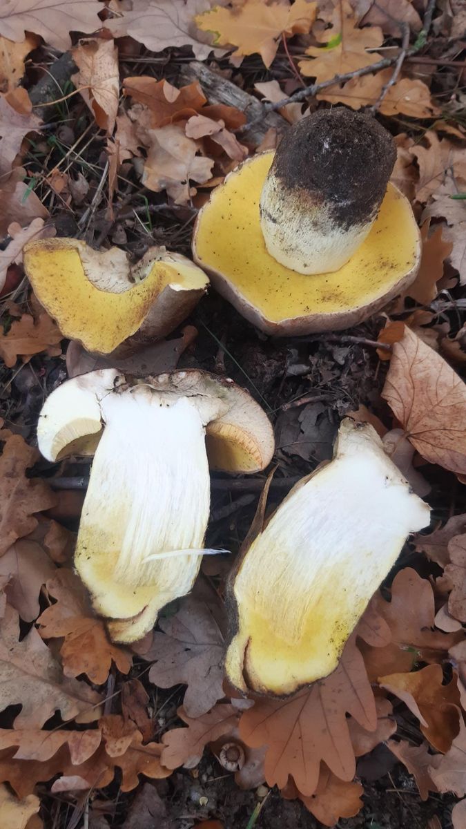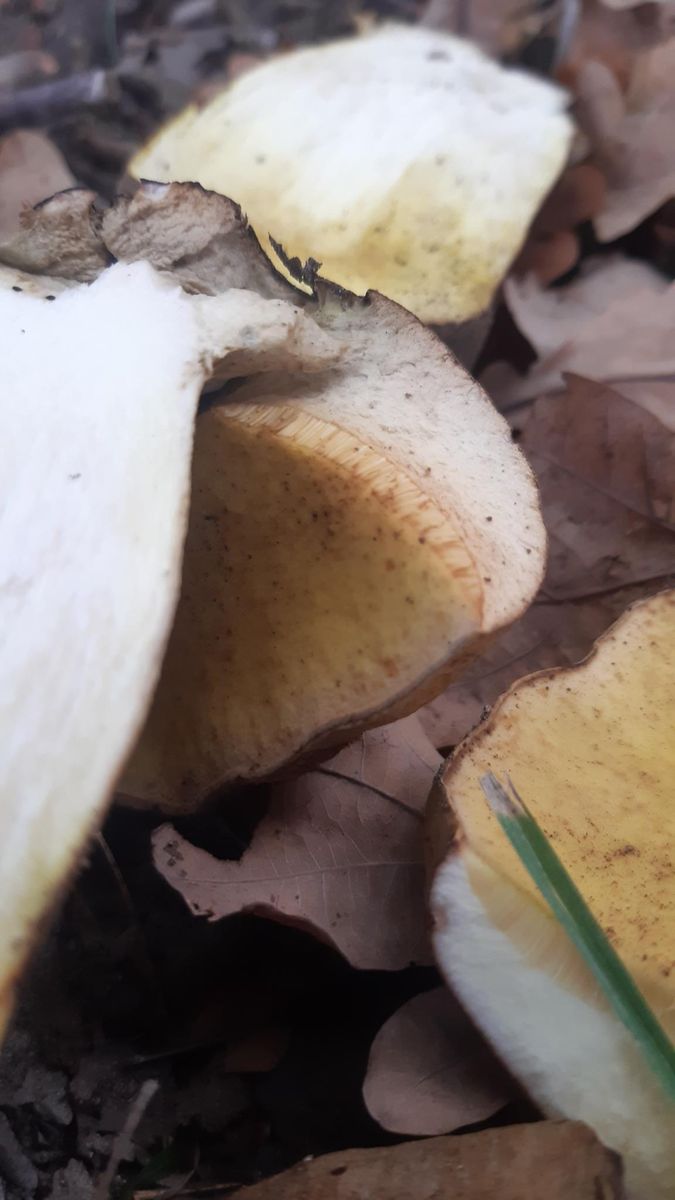 Diese Fotos entstanden heute, leider ist nicht jedes Detail zu sehen, aber dafür sind sie nicht so schlecht wie mit meiner kaputten Handykamera. Diese Pilze fanden sich zwischen Straße und Kanalufer unter Eiche (ach das sieht man ja auch auf dem Foto). Die Schnittbilder sind vom kleinsten und schon umgestoßen vorgefundenen Exemplar, mehrere wesentlich größere gab es auch und haben wir stehen gelassen (siehe letztes Foto). Dieser wurde dann auch am Waldrand wieder ausgestreut. Geruch wurde als angenehm-pilzig wahrgenommen, der Geschmack als ganz leicht bitter. Daher auch meine Idee Hemileccinum depilatum. Wie haben sie noch eine Stunde mit uns rumgetragen in der Hoffnung im Naturschutzzentrum jemand kundigen zu treffen.