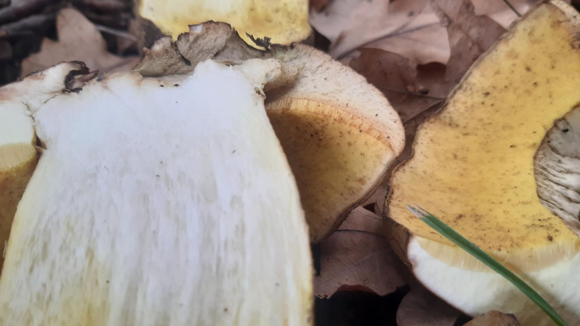 Sie haben nicht im geringsten geblaut und weitgehend nicht gerötet, ein leichter Schimmer orange fand sich an einer älteren Bruchstelle an den Röhren und das Stielfleisch veränderte sich nach längerer Zeit im Mittelteil leicht Richtung rotbraun. Insgesamt wirkten in natura Stiel, Stiel- und Hutfleisch noch deutlich gelber - abgesehen vom Detailfoto des Stiels, das später bei anderem Licht aufgenommen wurde und die Gelblichkeit des Erscheinungsbildes etwas sehr betont.