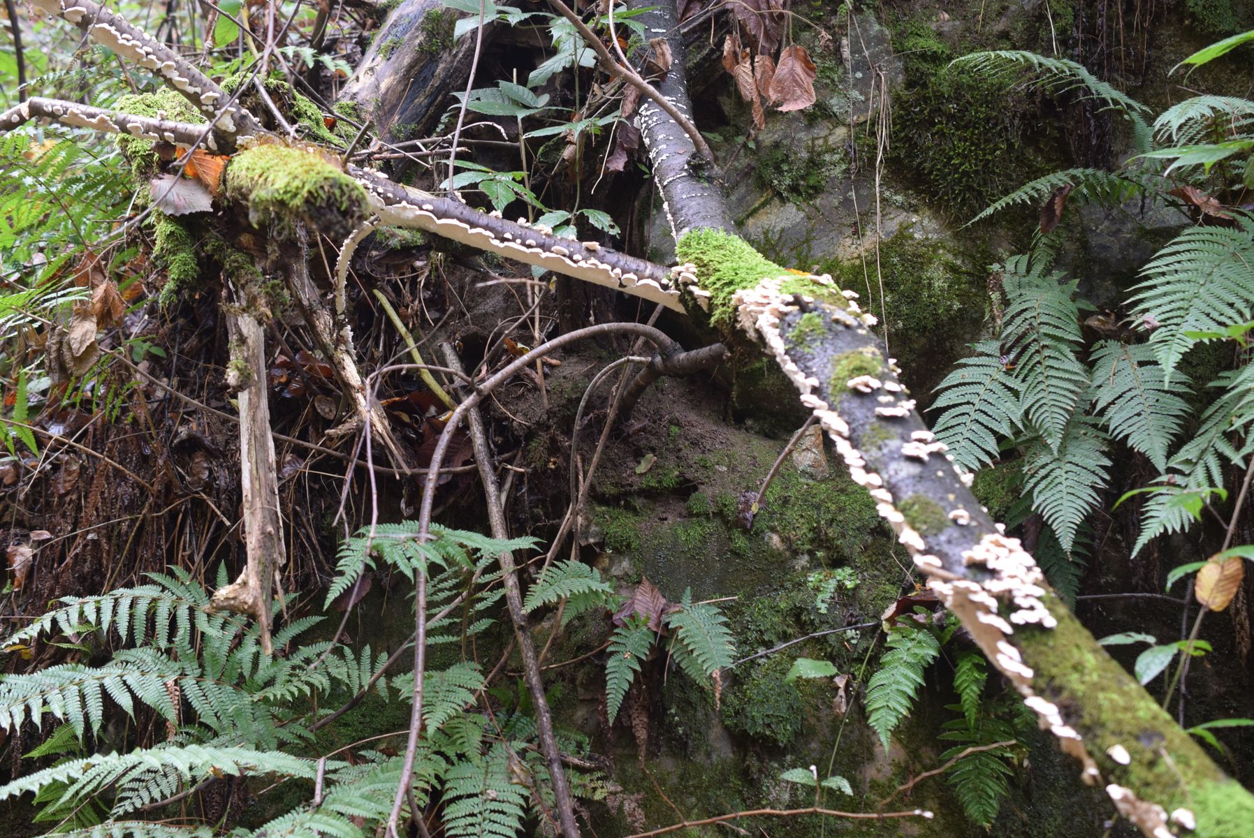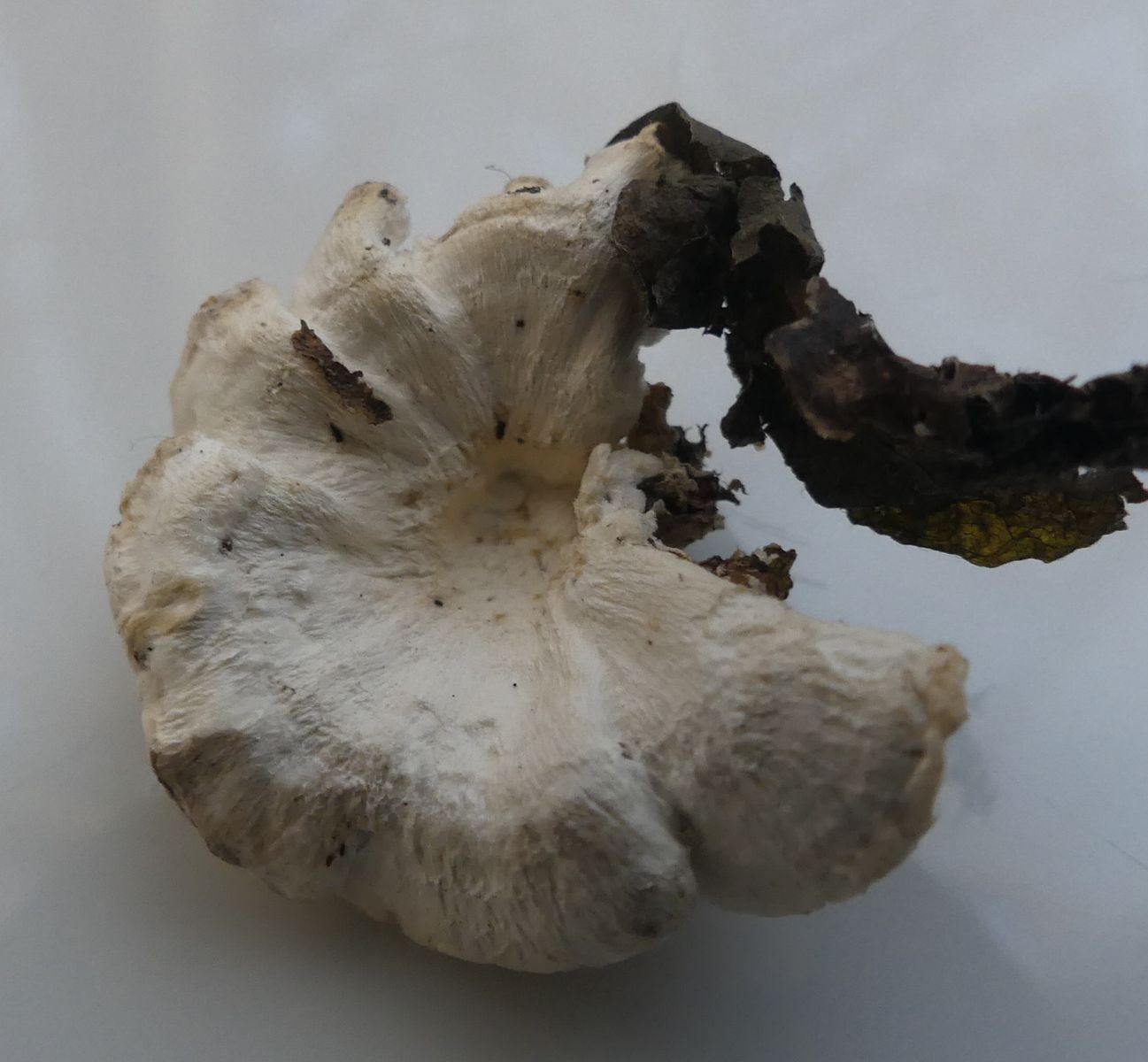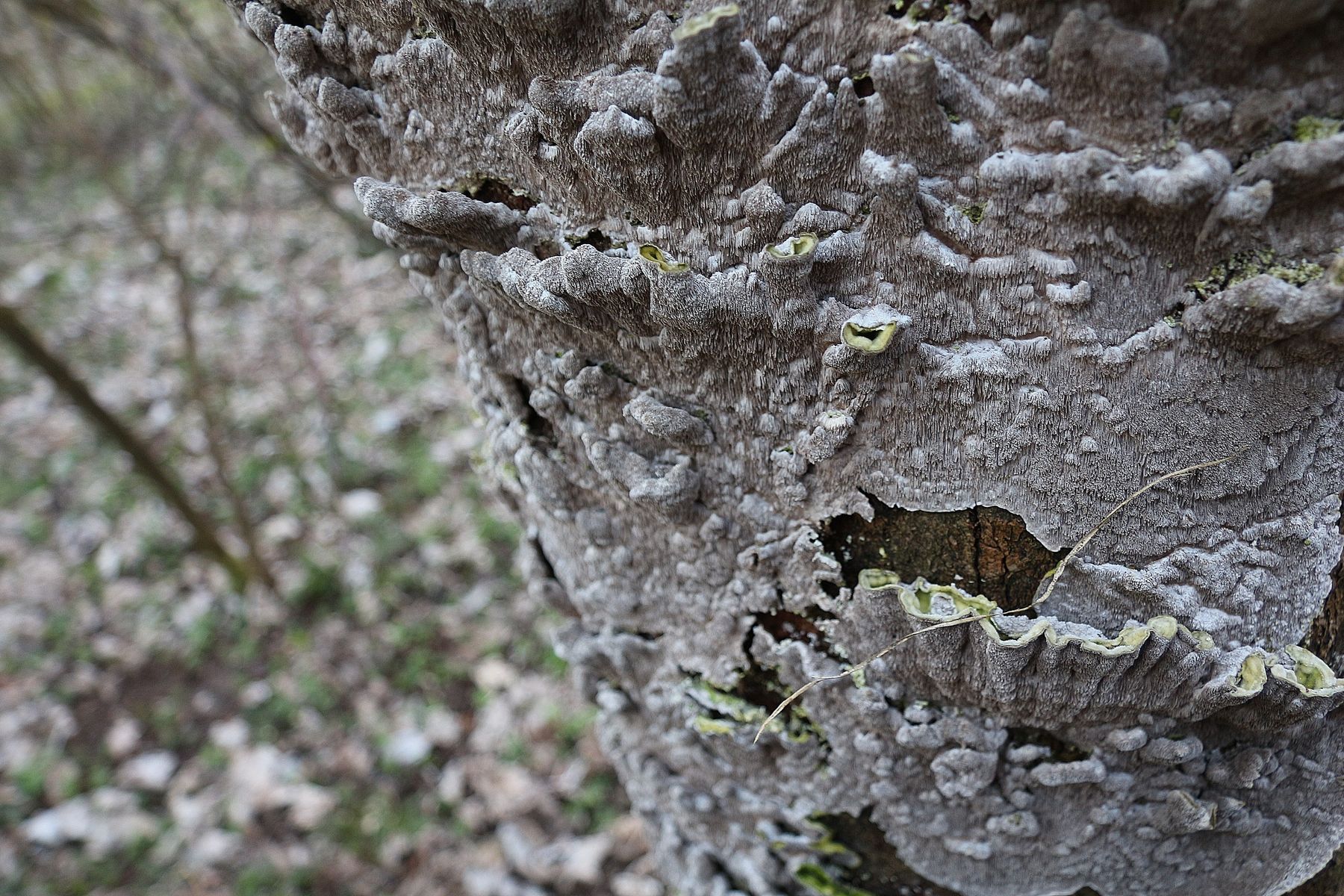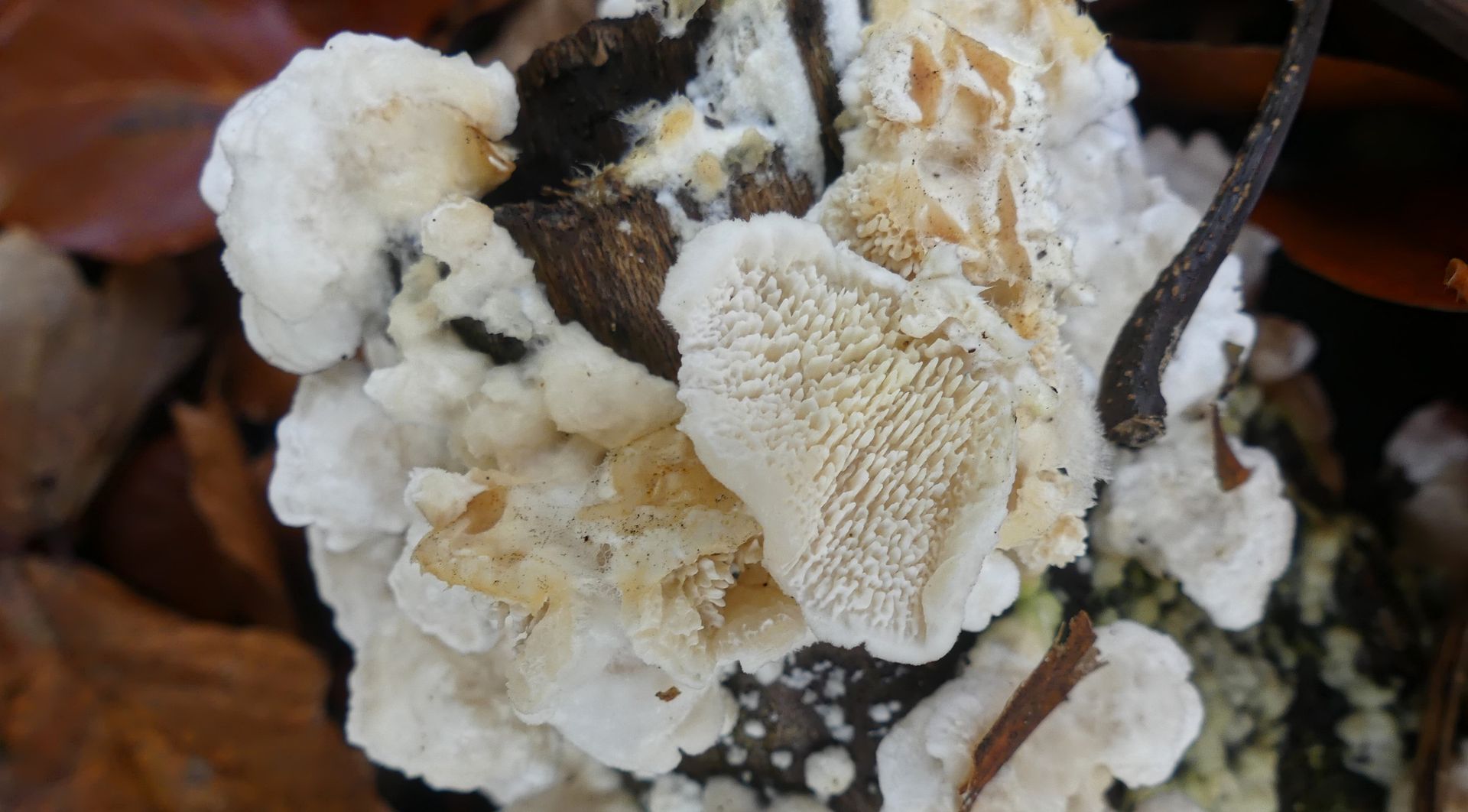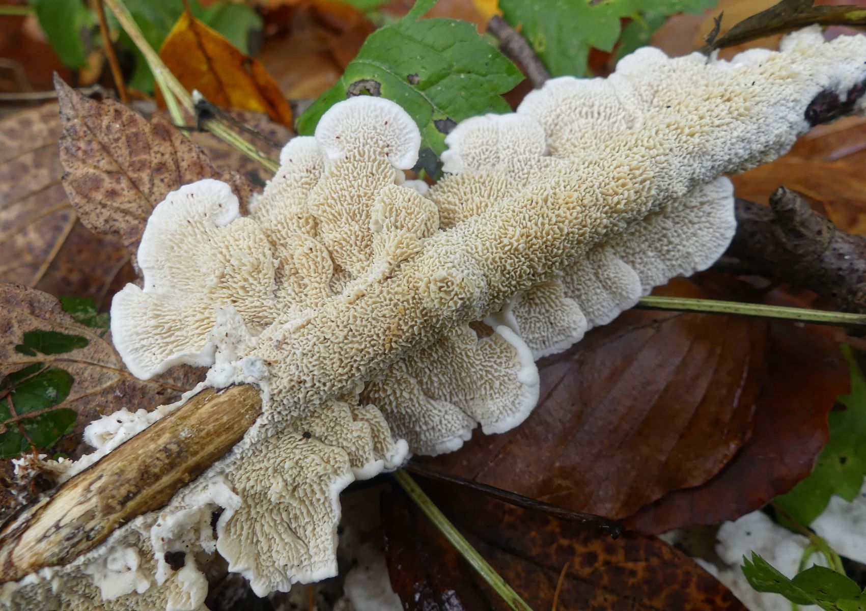 Irpex lacteus wäre eine Option, allerdings habe ich da solche "gestielten" Fruchtkörper, wie im zweiten Bild von Maria noch nicht gefunden. Interessant wäre, ob die Fruchtkörper eher weich oder sehr zäh waren.