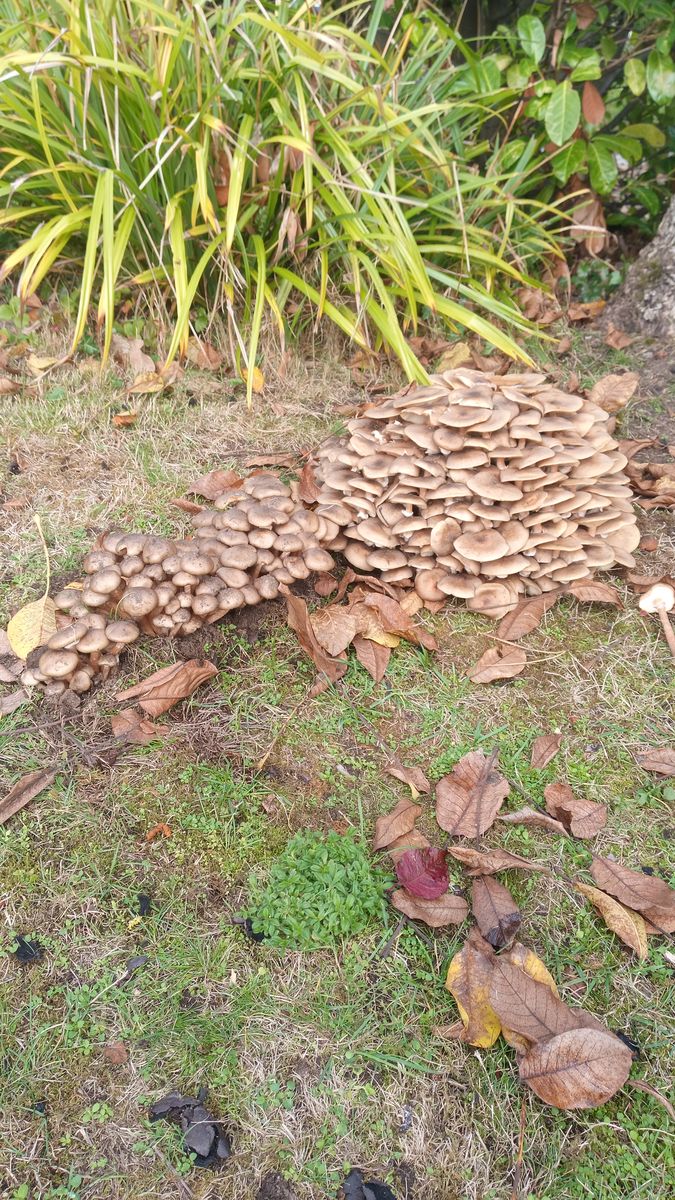 Ich habe vor 2 Tagen im Wurzelbereich meines Walnussbaums ein große "Nest" mit vielen Pilzen entdeckt, wie auf dem Bildern zu sehen ist. Was auf den Bildern leider nicht zu erkennen ist, sind die vielen Lamellen der einzelnen Fruchtkörper. Zwei zur Bestimmung verwendete Apps sagen entweder mit einer gewissen Wahrscheinlichkeit Hallimasch oder Stockschwämmchen, was wahrscheinlich beides nicht gut für den Baum ist. Kann anhand der angehängten Bilder und meiner Beschreibung die Pilzart bestimmt werden? Und falls es sich tatsächlich um einen solchen Baumschädling handelt, bleibt dann nur die Fällung? Und wie könnte man noch gesunde Bäume schützen? Da wir vor ca. 3 Jahren bereits an anderer Stelle auf dem Grundstück eine sehr schöne alte Wildkirsche aufgrund eines aushölenden Pilzes fällen mussten, habe ich nun etwas Angst, erneut einen alten Baum zu verlieren. Hier in der Siedlung gibt es so gut wie kaum noch große Bäume.