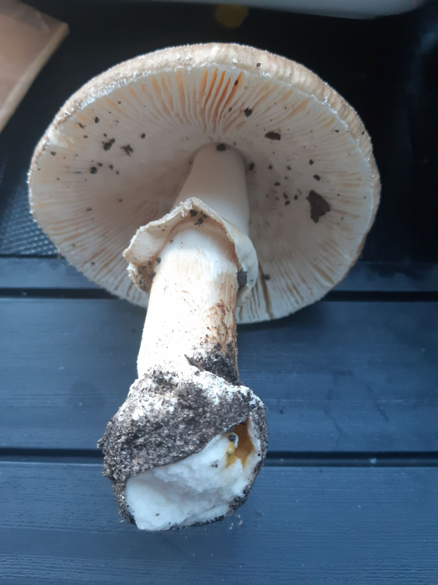 Diesen Pilz habe ich neben vielen Spechttintlingen in groben Rindenmulch gefunden. Der Stiel ist fest, leicht brüchig und fasert. Die Lamellen sind fest mit den Fleisch verbunden und brechen nicht aus. Der Stiel ist hohl. Mir vielen besonders die weißen Reste auf dem Hut auf. Nach meinem Bestimmungsbuch kommt am ehesten der Perlpilz in Frage, obwohl der Stiel nicht passt.... vll habt Ihr eine Idee. Lg