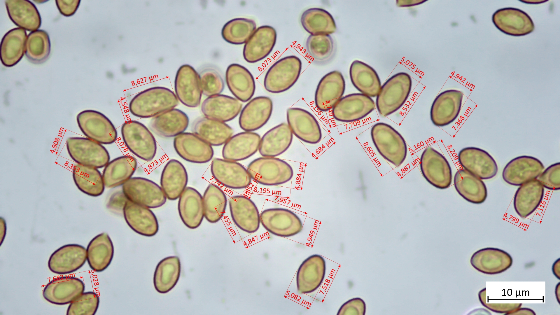 7,1-8,6 µm (av. 8,0 µm, SD 0,4 µm) x 4,5-5,2 µm (av. 4,9 µm, SD 0,1 µm); Q = 1,5-1,9 (av. 1,6, SD 0,1)(n = 17)