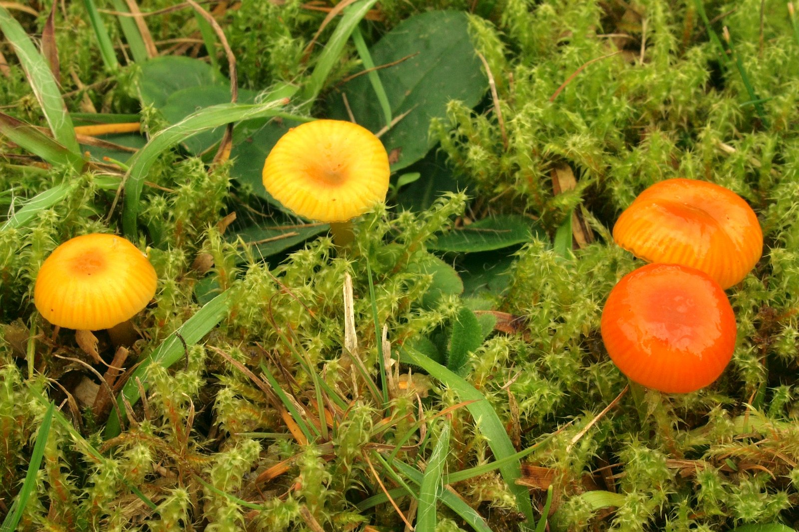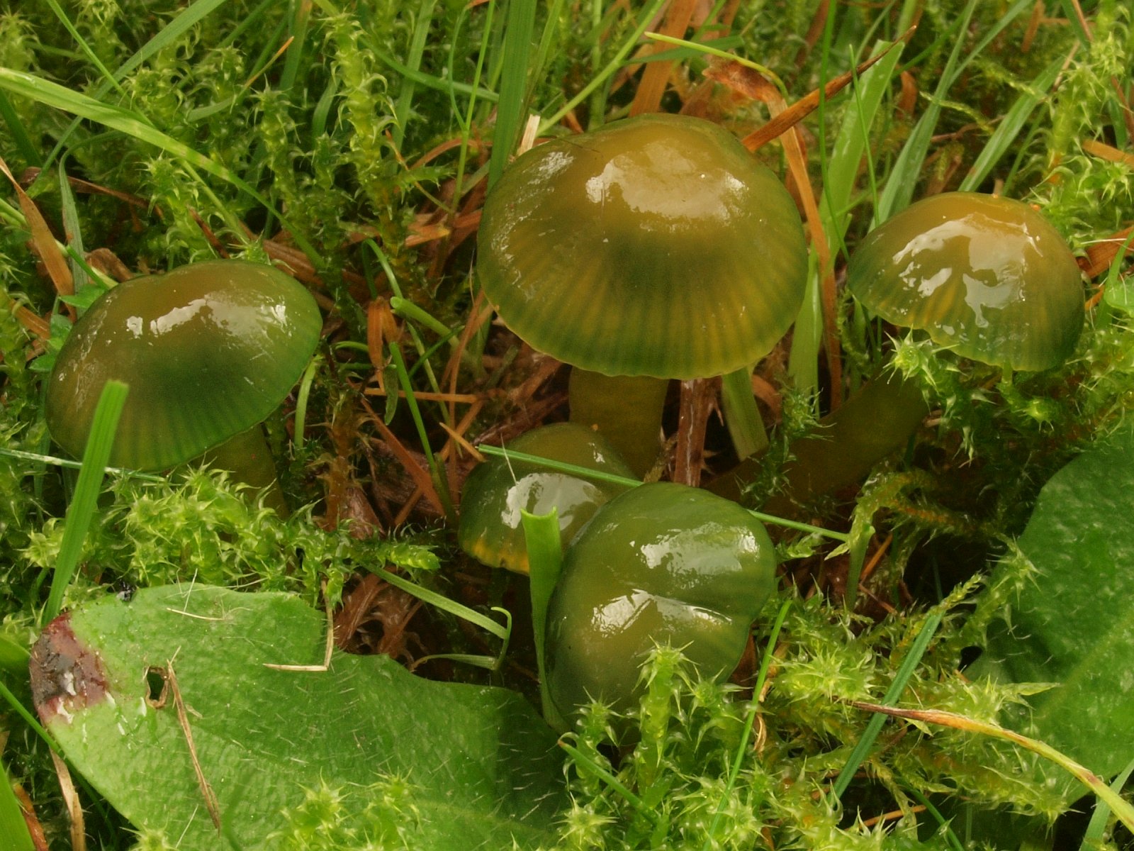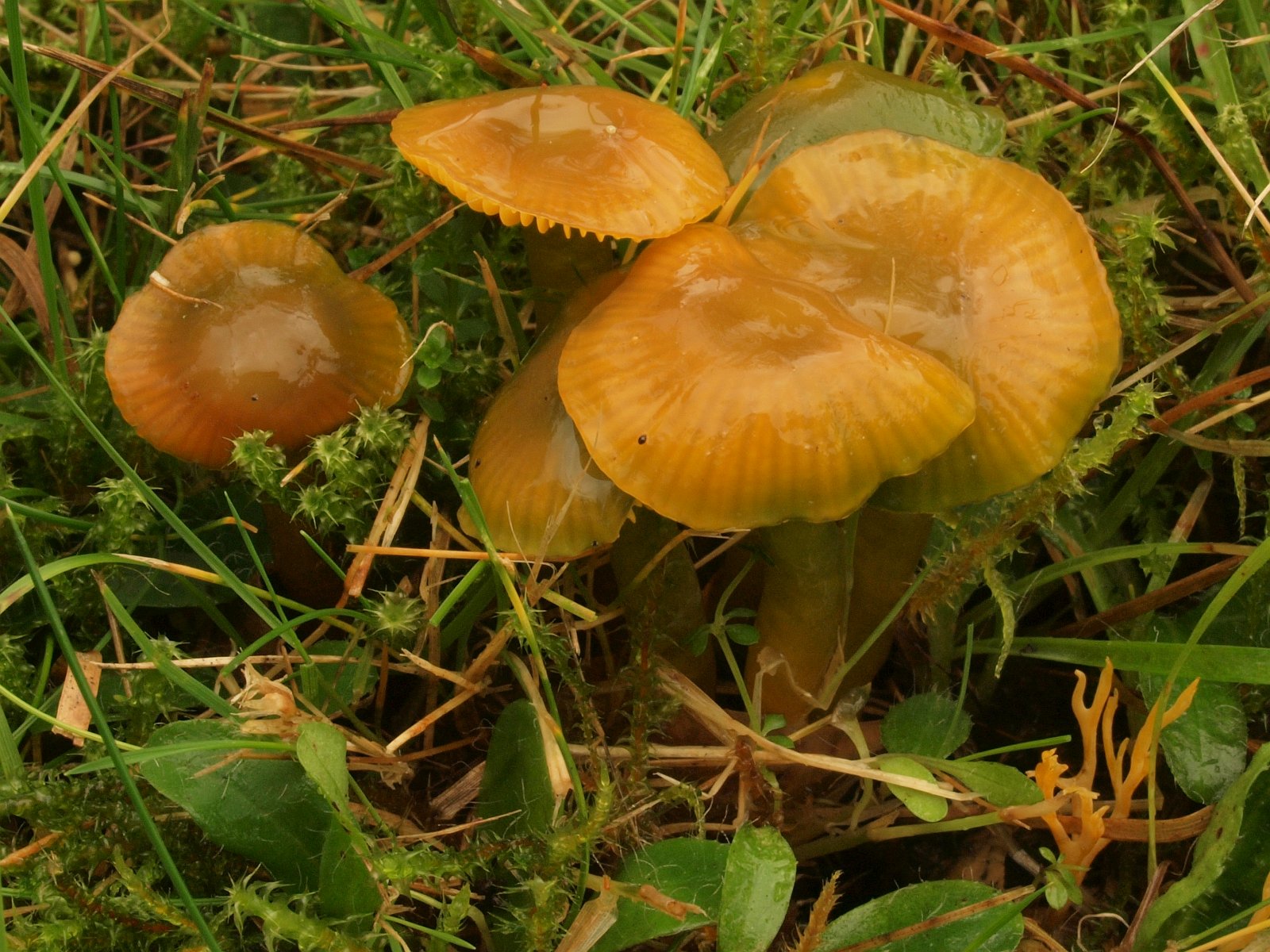 Papageien-Saftling (Gliophorus psittacinus) Recht unten im Bild ist noch der Kreuzsporige Glöckling (Entoloma conferendum) zu sehen, aber der wurde zur Nebensache