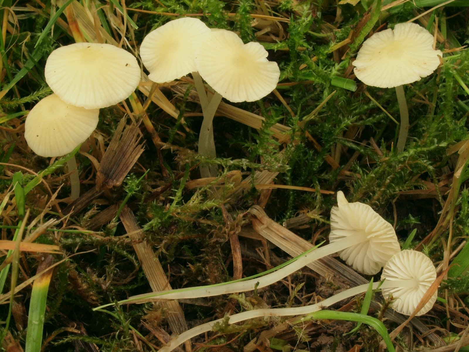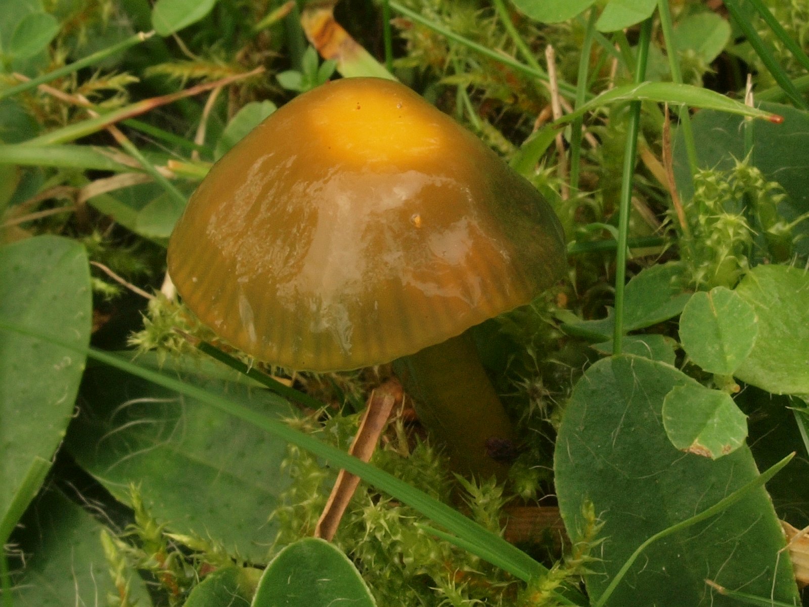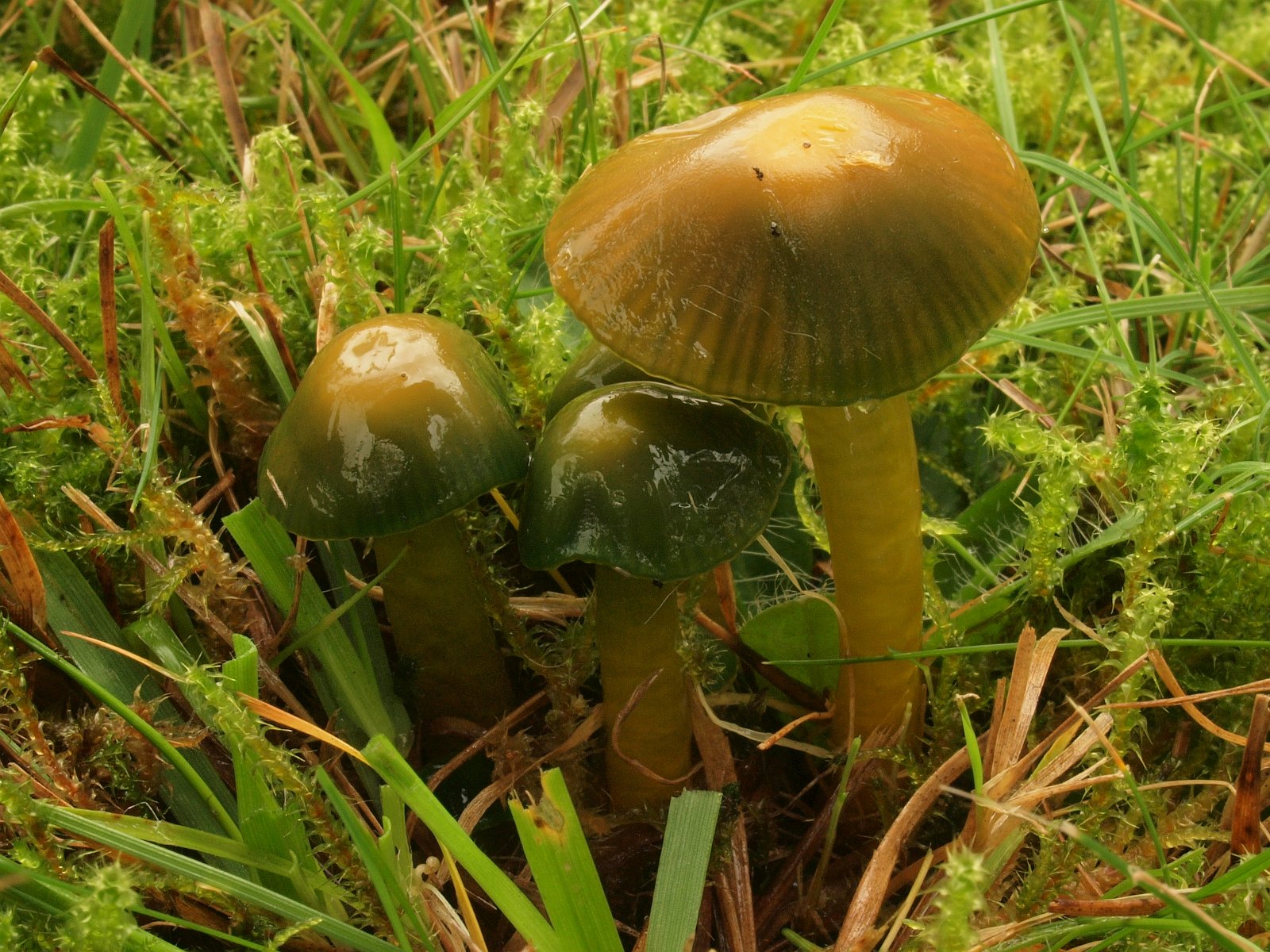 Papageien-Saftling (Gliophorus psittacinus) Recht unten im Bild ist noch der Kreuzsporige Glöckling (Entoloma conferendum) zu sehen, aber der wurde zur Nebensache