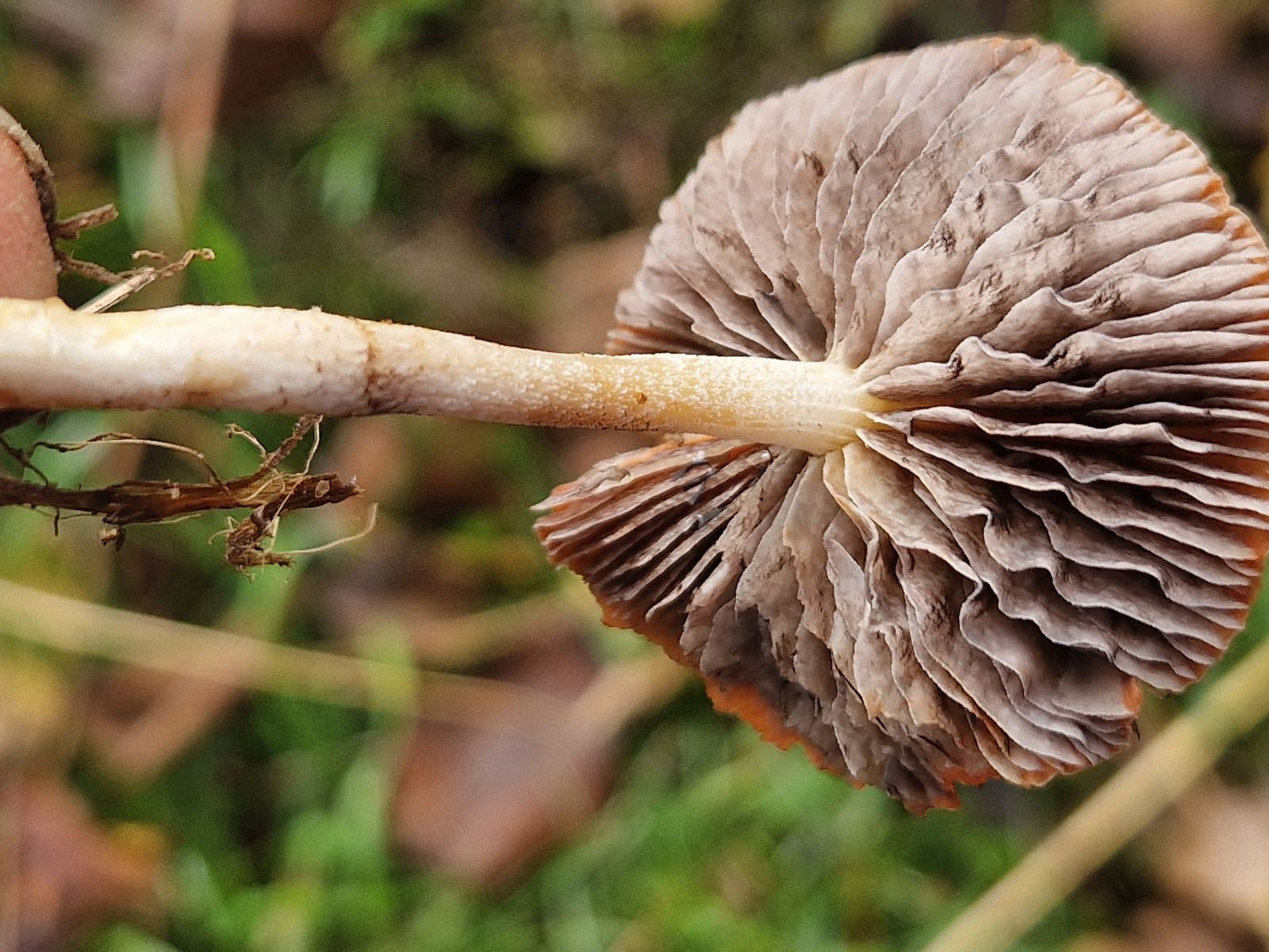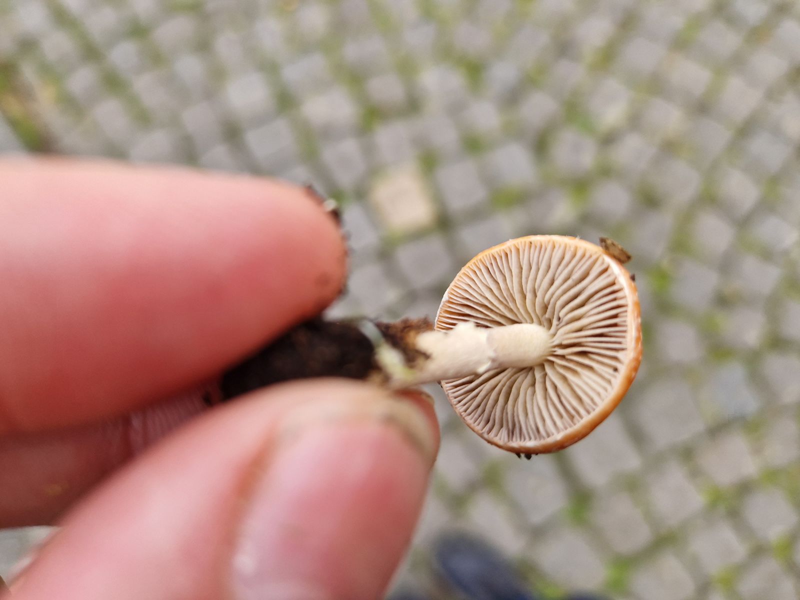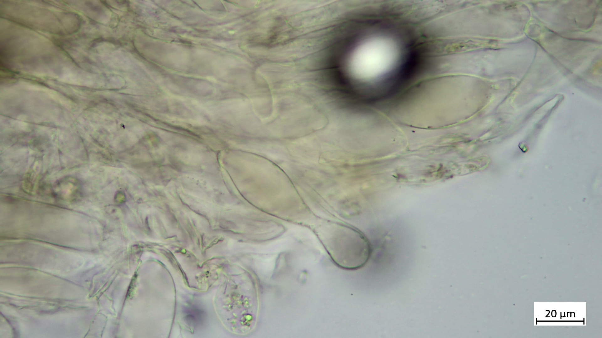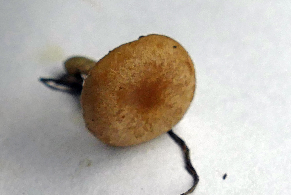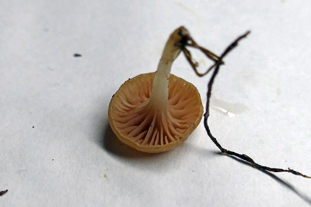 Auf der selben Wiese bekam ich etwas kleines, omphalinaartiges in die Hand gedrückt, das wir nicht direkt einordnen konnten und wollten. Manchmal ist es dann aber auch gut, wenn man die Dinge mal einen Tag liegen lässt,er zeigte dann plötzlich vor dem Mikroskopieren auf einmal eine ganz komische Lamellenfarbe:
