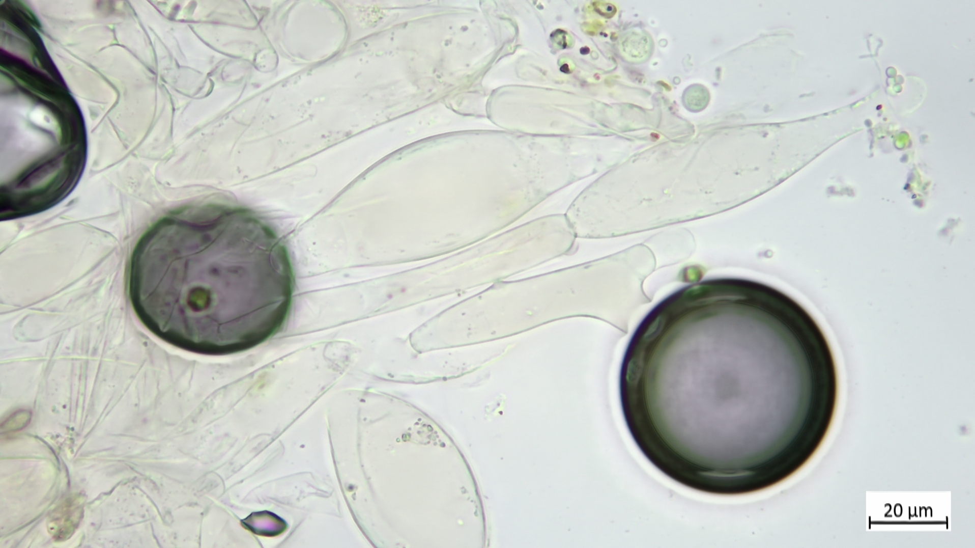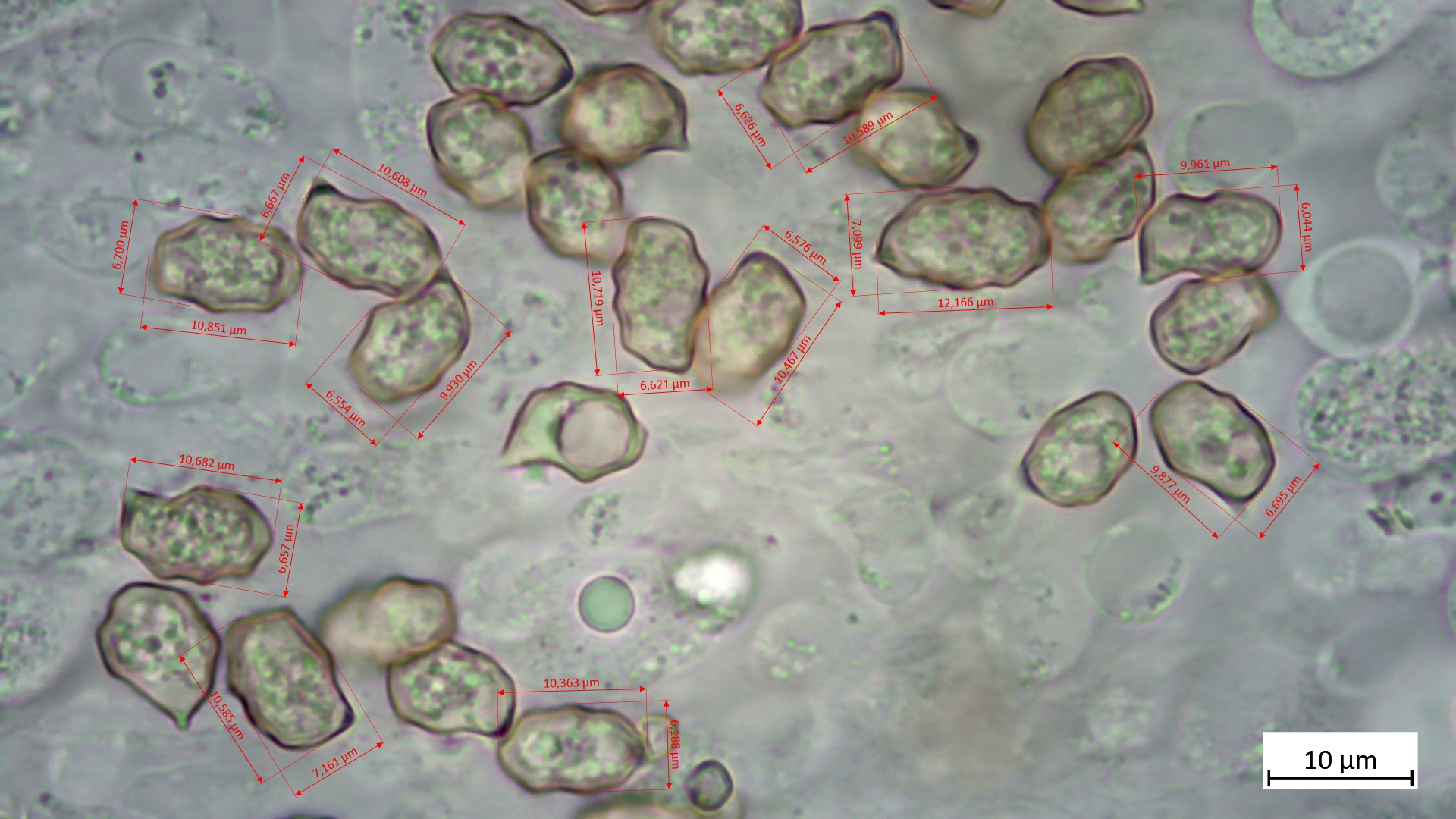 Sporen eckig, heterodiametrisch: 9,9-12,2 µm (av. 10,6 µm, SD 0,58 µm) x 6-7,2 µm (av. 6,6 µm, SD 0,3 µm); Q = 1,5-1,7 (av. 1,6, SD 0,07) (n = 12)