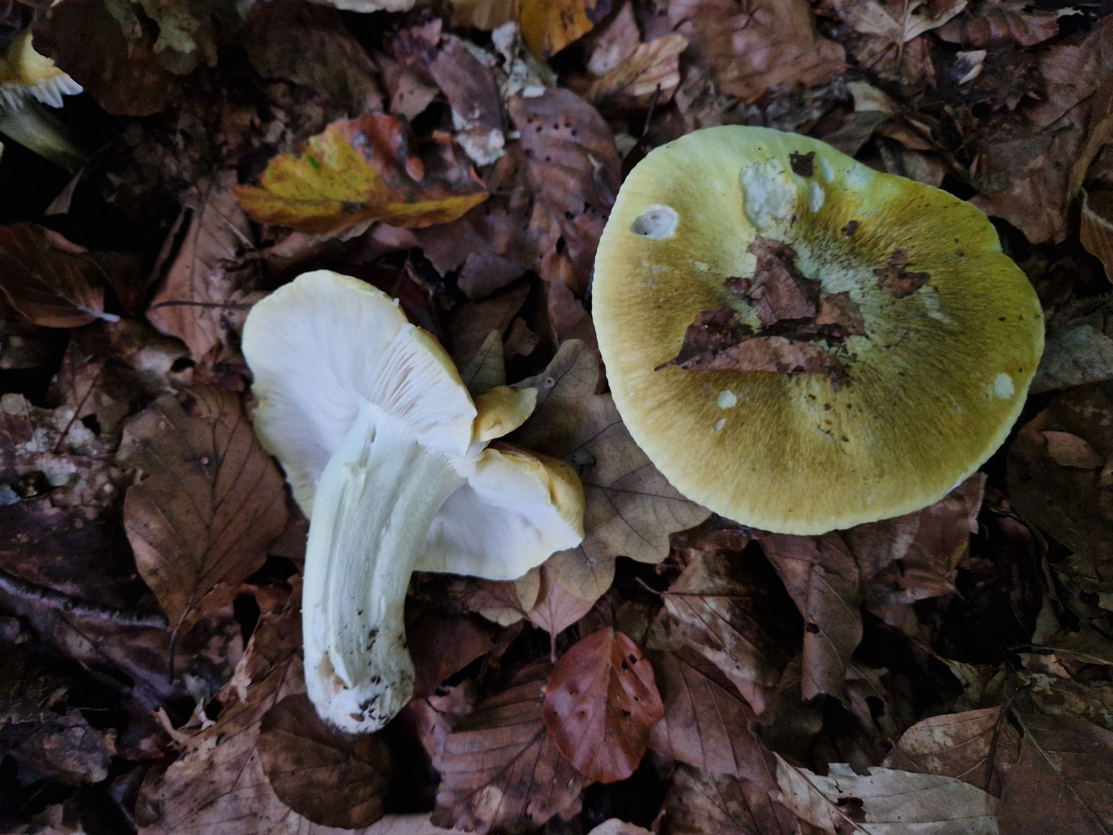 Es war schon etwas dunkel, als ich den fand. Hatte im Halbdunkel auf den ersten Blick auf die ungewohnten Fruchtkörper an einen Täubling gedacht, so mit den grünen Farben und wie er da so stand. Hat sich dann aber schnell aufgelöst: