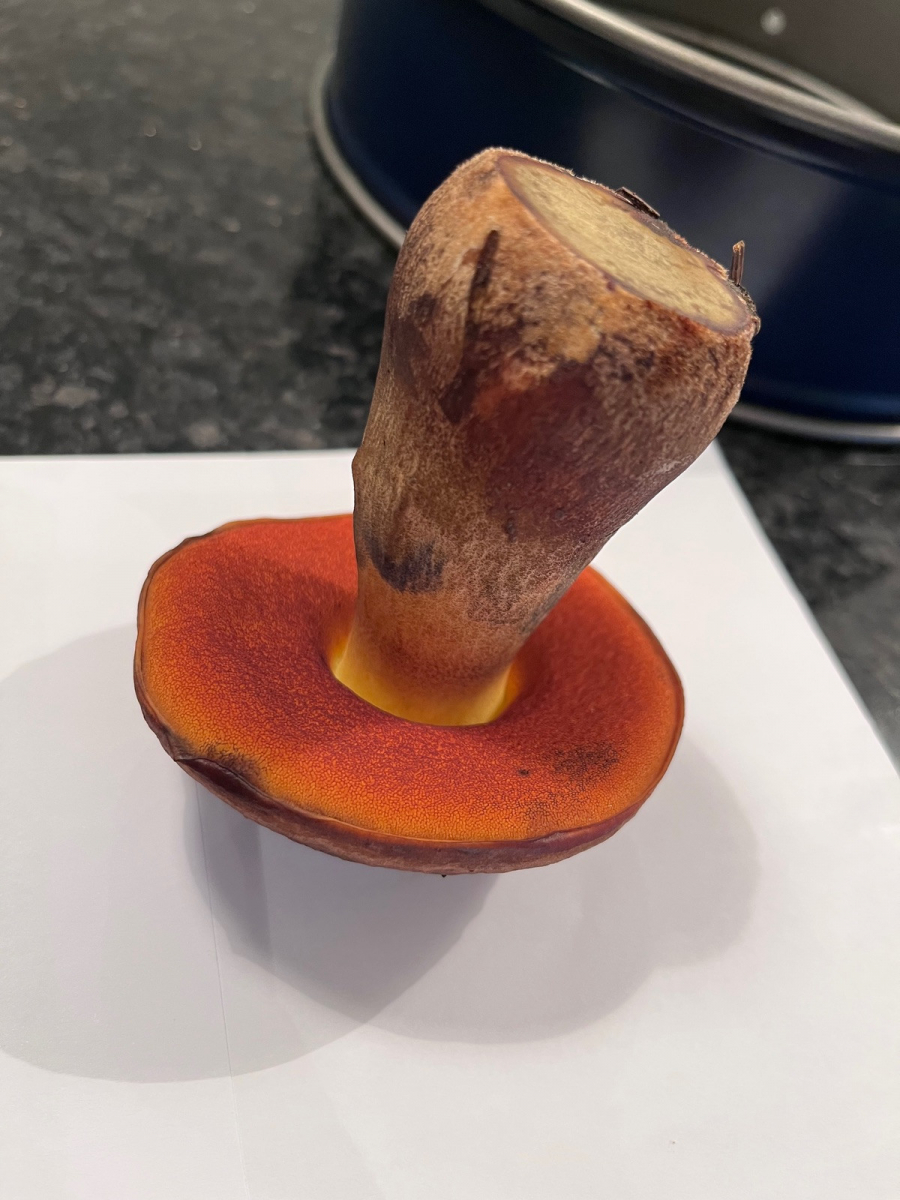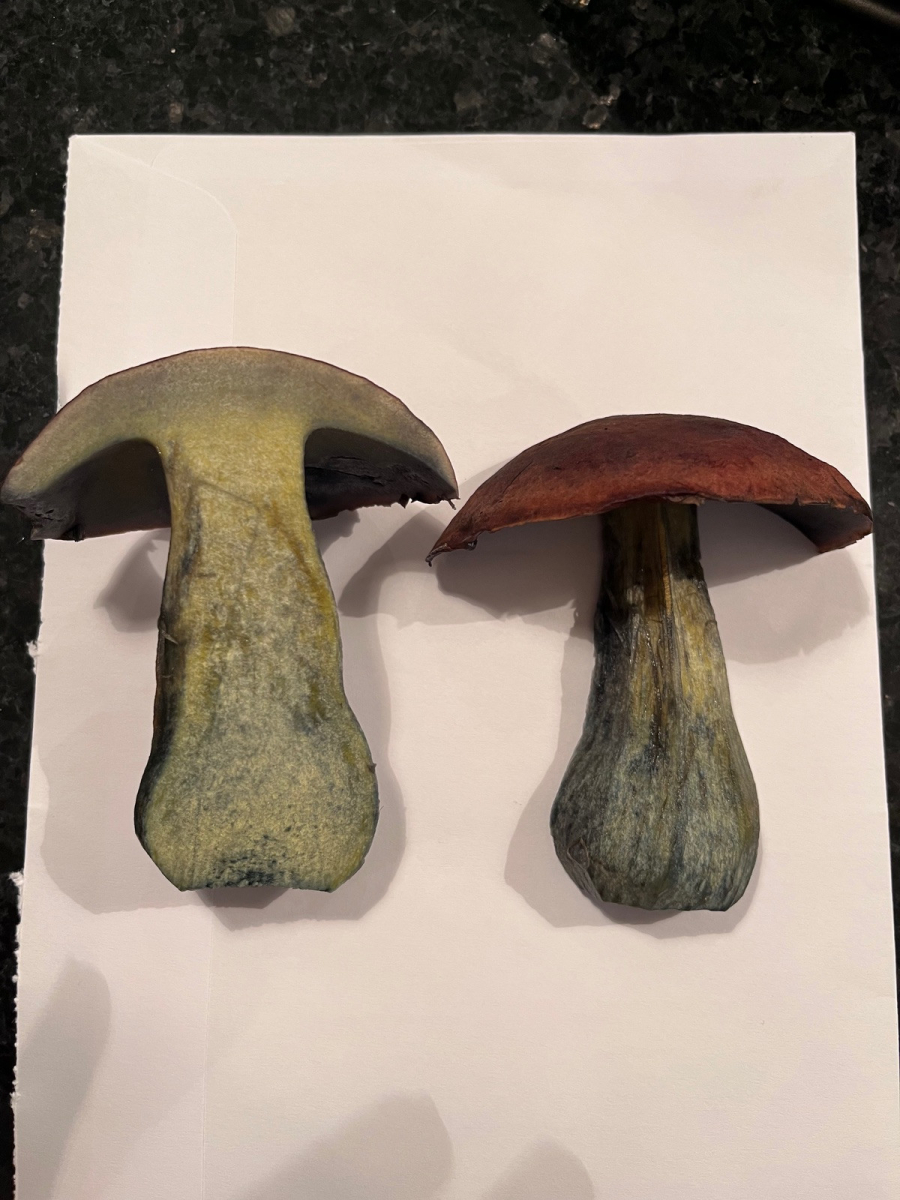 Gefunden im Moos unter Fichten, mehrere zusammen. Fleisch leuchtend gelb, verfärbt sich sofort blau.