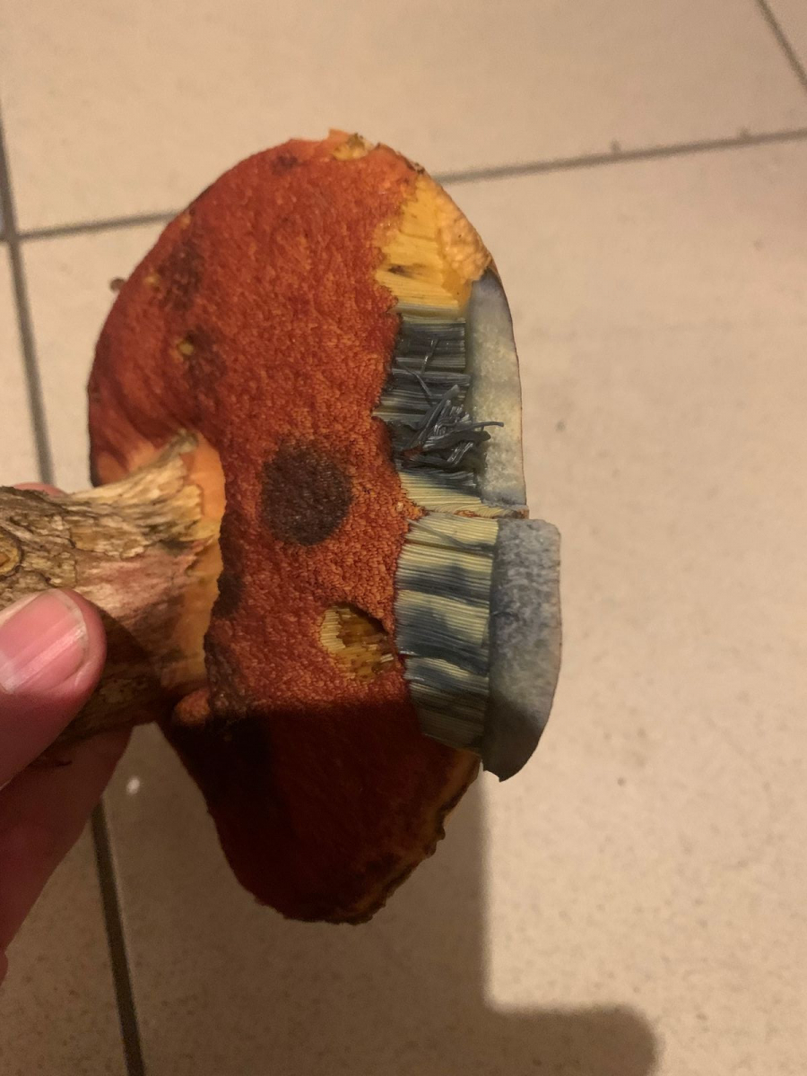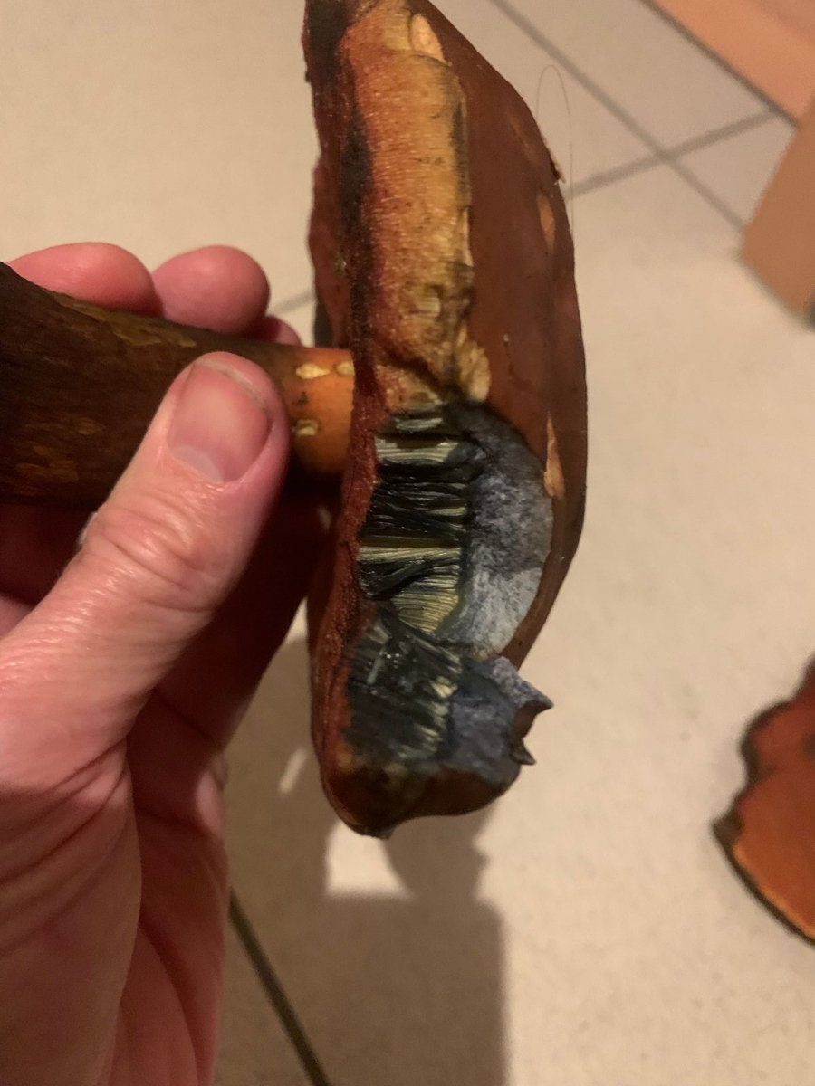 Nachdem ich den Stil angeschnitten habe, sind alle drei Pilze sofort blau verfärbt.