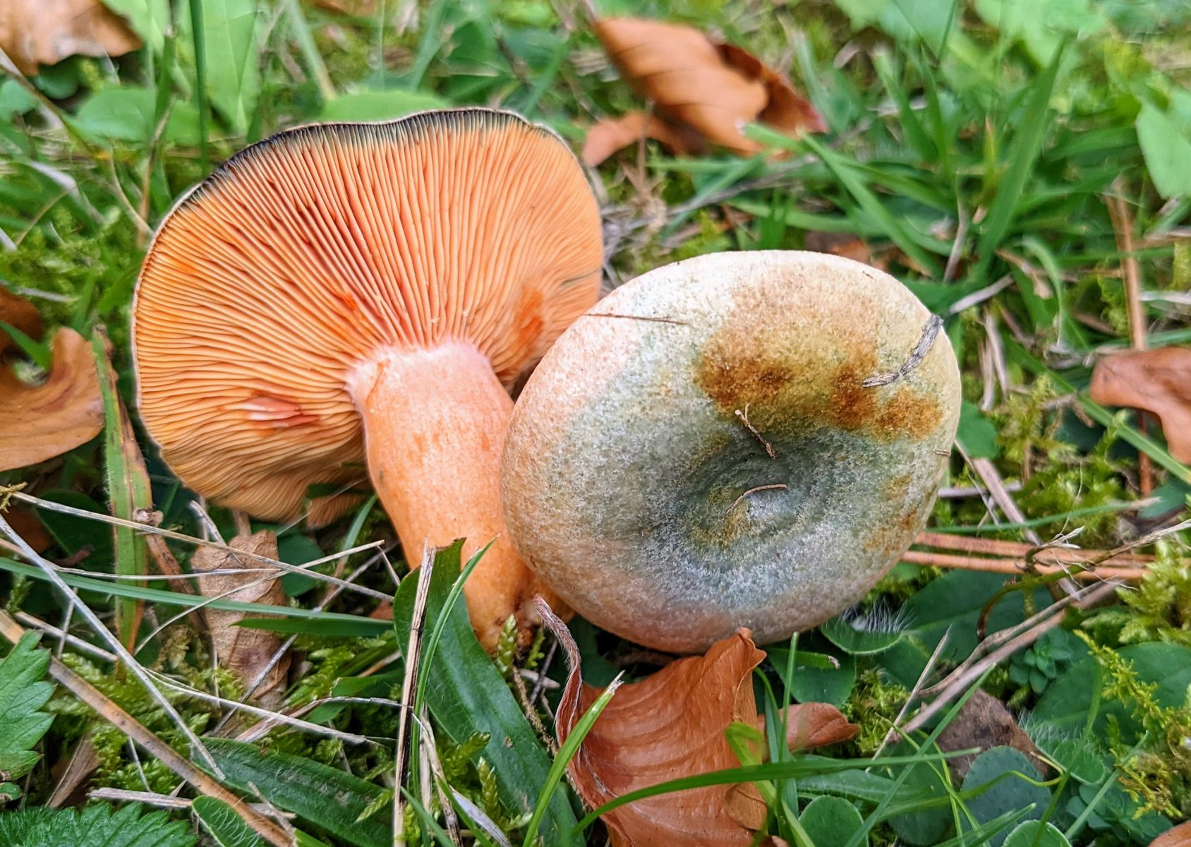 In einem anderen Wald fand ich heute auf einem kleinen Rasenstück grüne Reizker. Ich tippe auf Spangrüne Kiefernreizker, weil Kiefern die einzigen Nadelbäume in der Nähe waren.