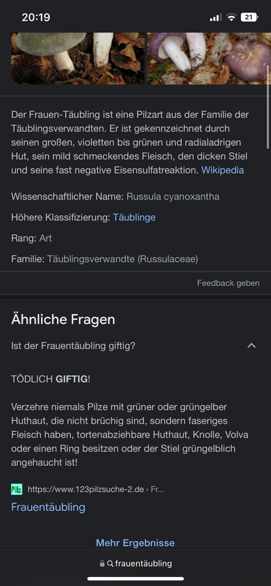 Ich habe jetzt 2 Bücher und 10 Videos zu Frauentäubling vs grüner Knollenblätterpilz geguckt. Kein Kuchenstück-fömiges abziehen der Huthaut, keine Knolle kein Ring, Lamellen direkt am Stiel beginnend, violette Huthaut, elastische Lamellen etc, also es muss ein Frauentäubling sein, jedenfalls kanns kein Knollenblätterpilz sein. Ich denke ich probier den kleinen mal.